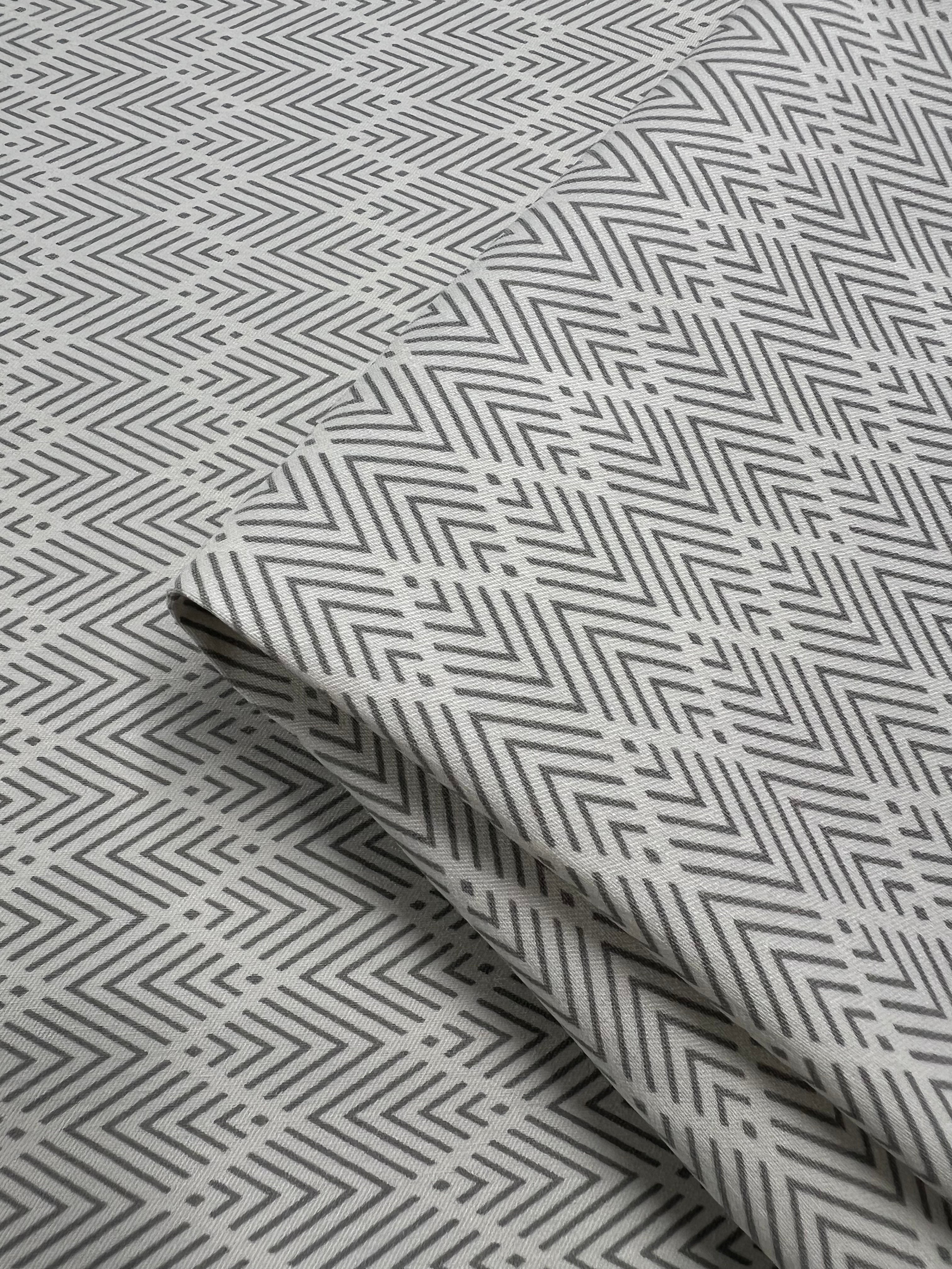 A close-up image of folded Bengaline - Direction - 145cm by Super Cheap Fabrics with an intricate, repeating zigzag pattern in black and white. The geometric print fabric creates a visually dynamic texture, with the layers neatly arranged to show the continuity of the design.