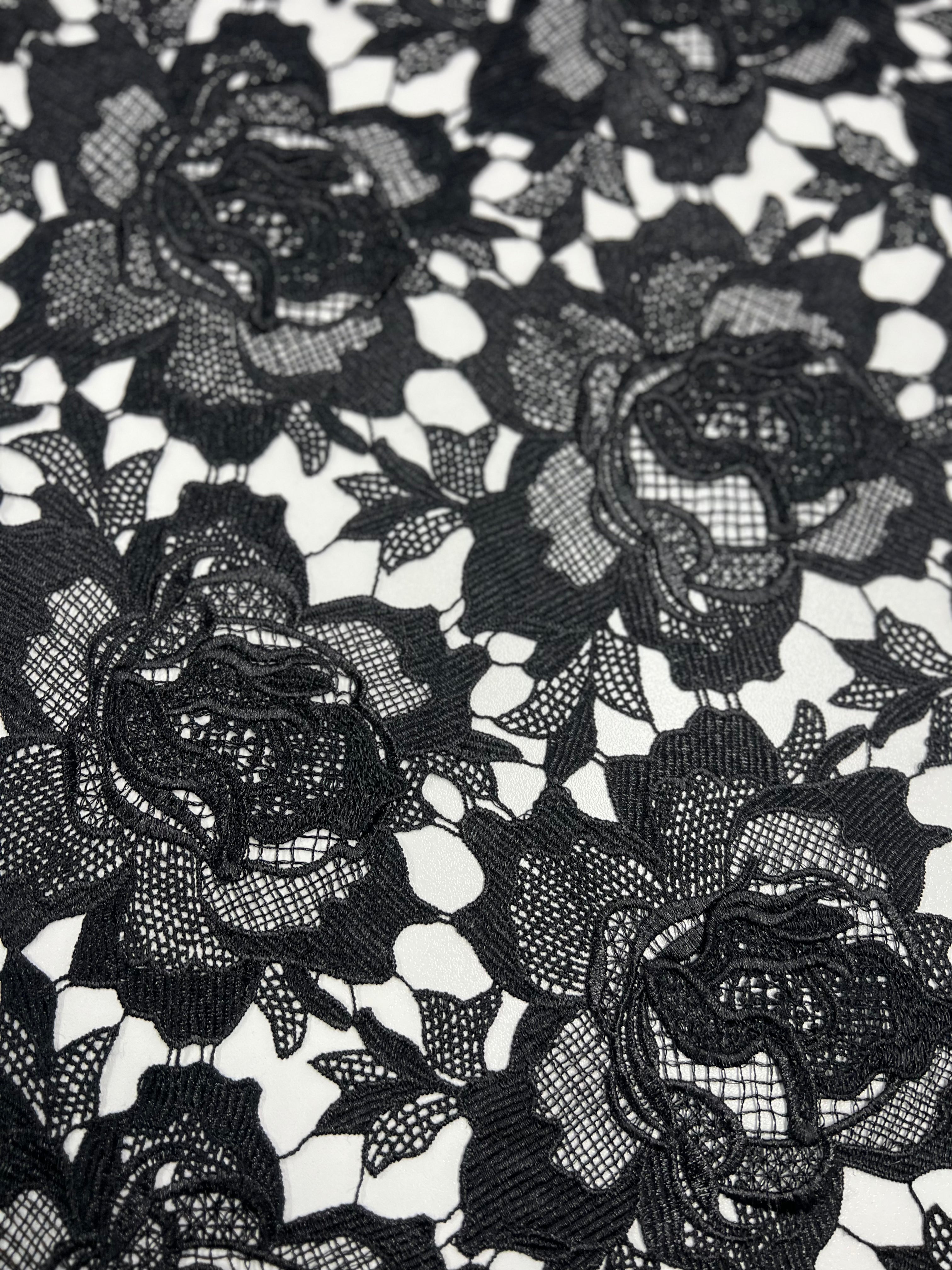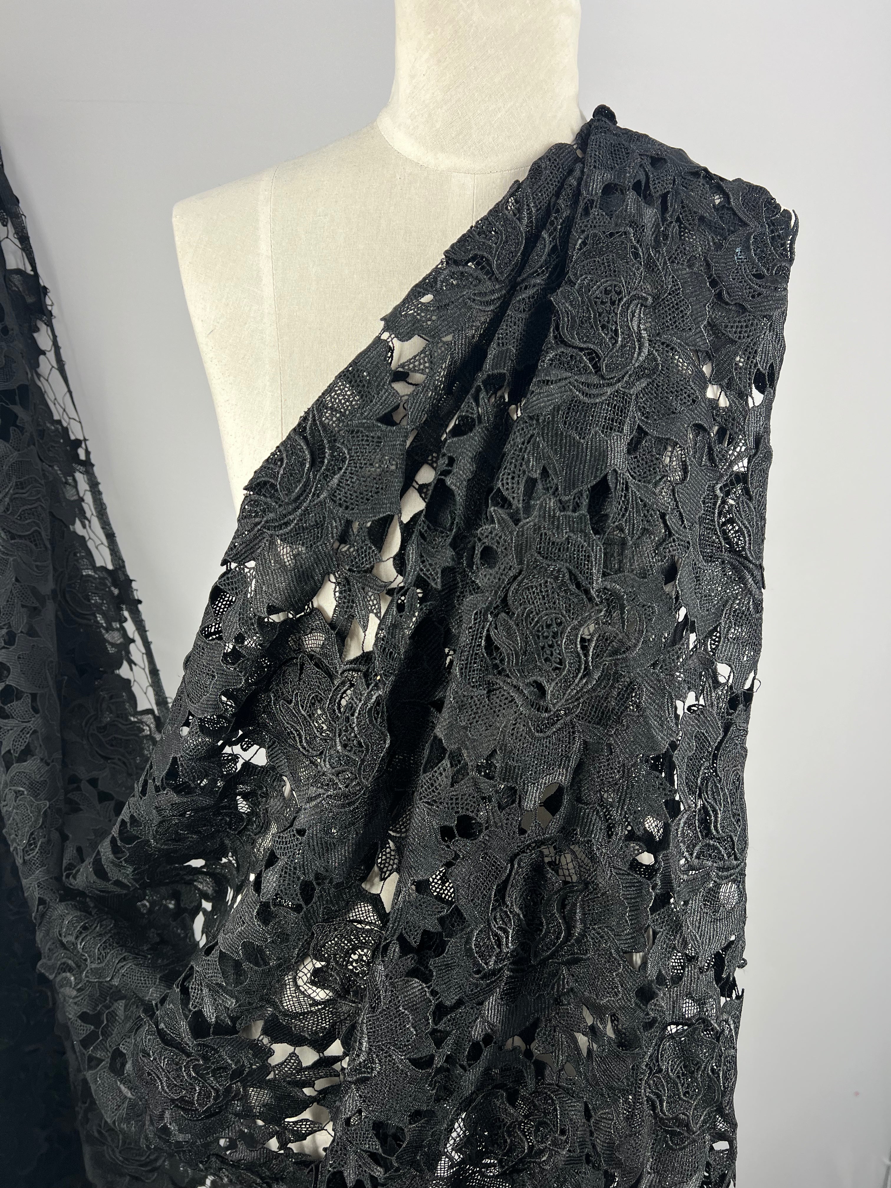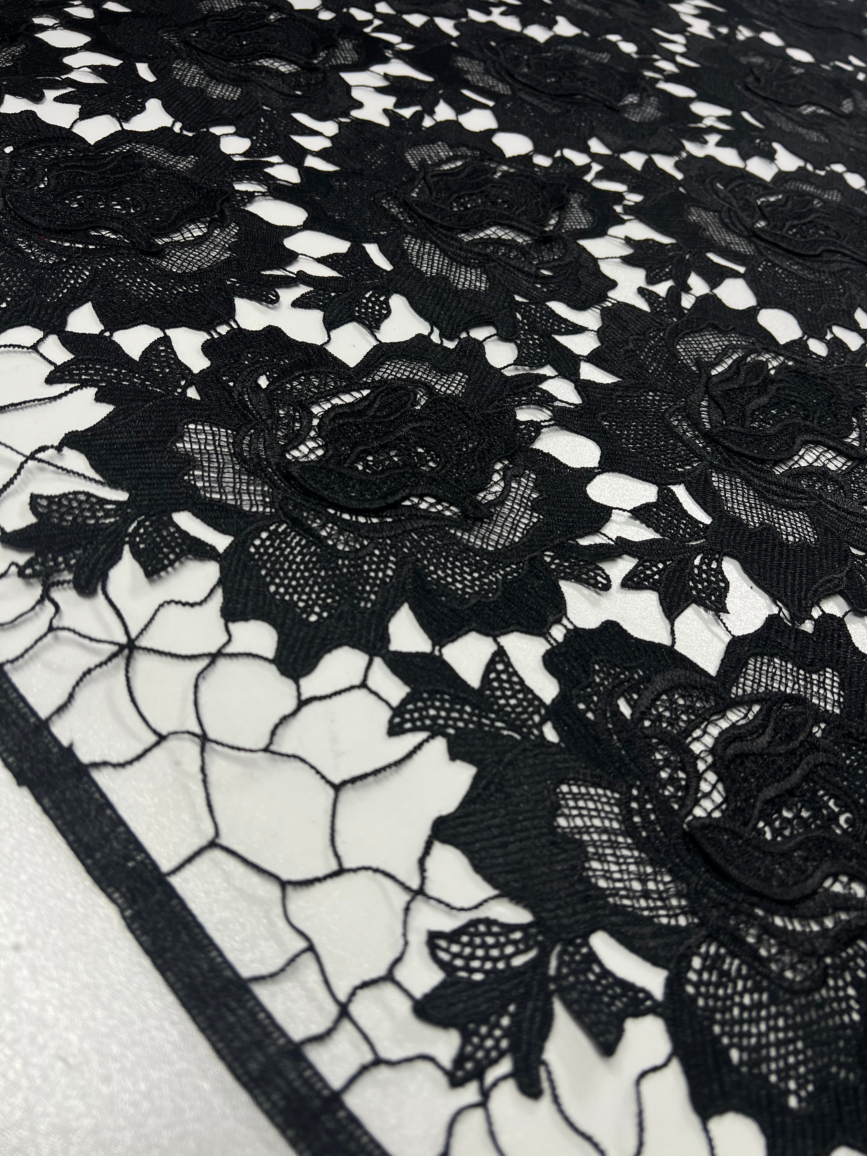 A close-up image of 120cm width black floral lace fabric against a white background. The Designer Anglaise Lace - Black - 120cm from Super Cheap Fabrics features intricate rose patterns and delicate mesh details, showcasing its fine texture and craftsmanship.