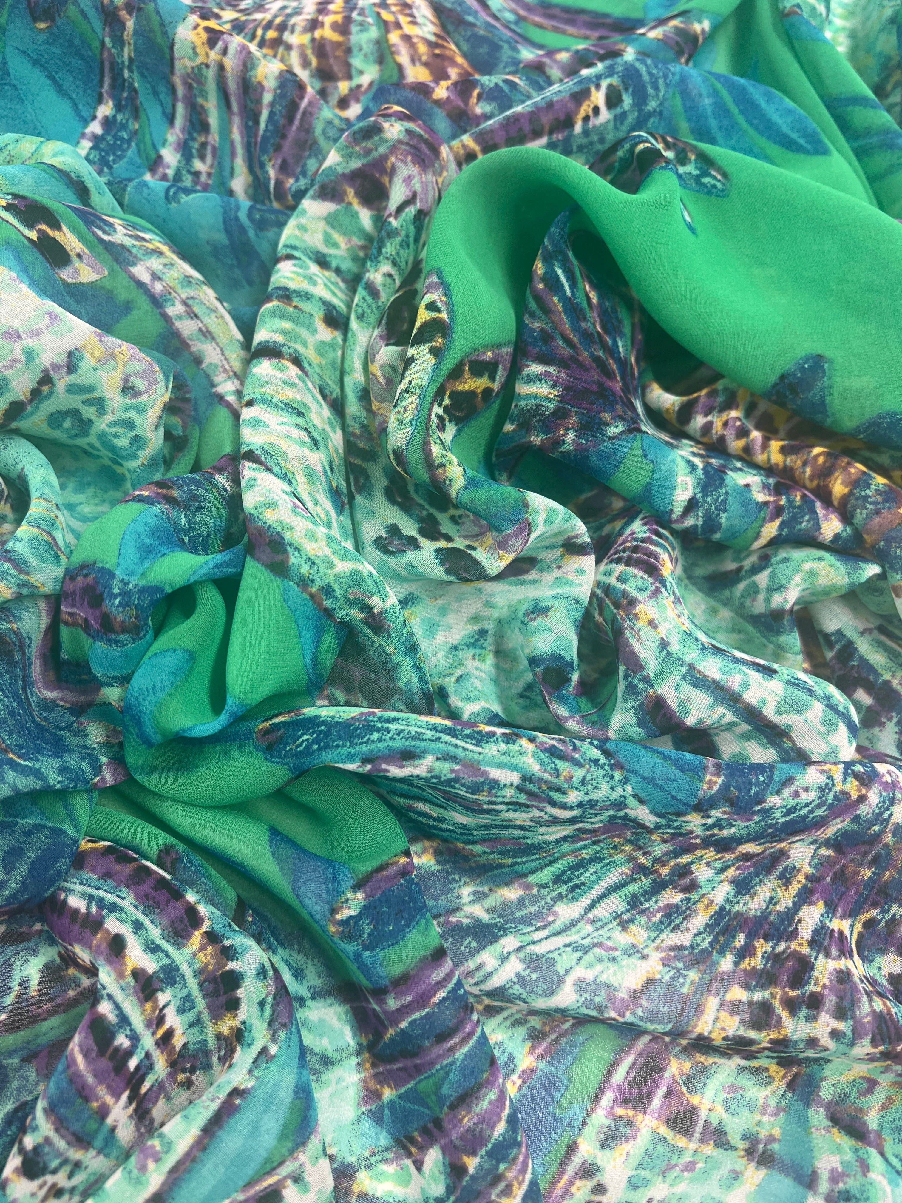 A close-up of a crumpled, colorful fabric featuring vivid green, turquoise, blue, and purple hues with abstract patterns and animal print elements. This Designer Chiffon - Leopard Palms - 150cm from Super Cheap Fabrics appears soft and semi-transparent with a mix of smooth and textured areas.
