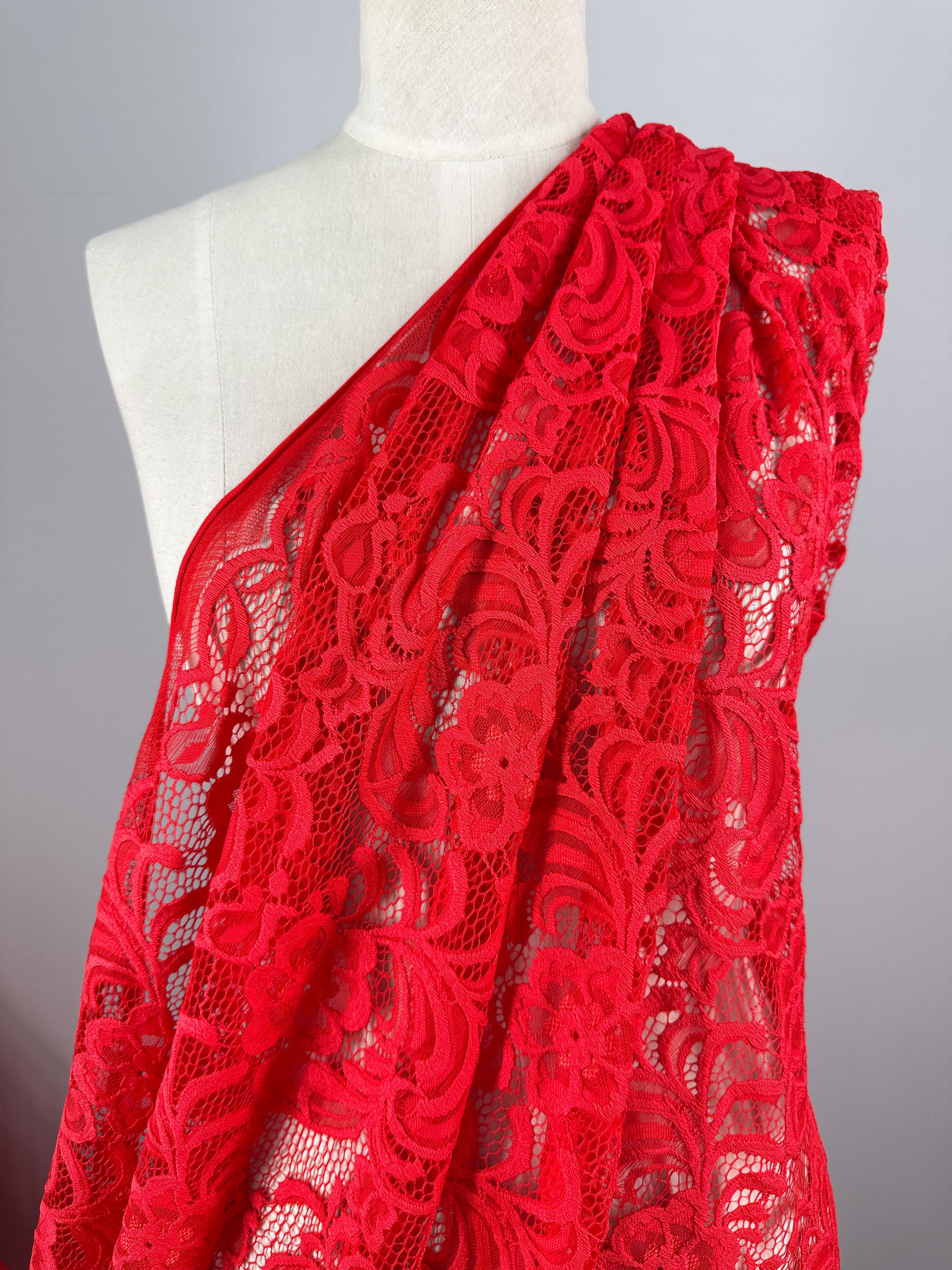 A delicate lace with a gorgeous red colour, stretchy and boasts a beautiful drape.