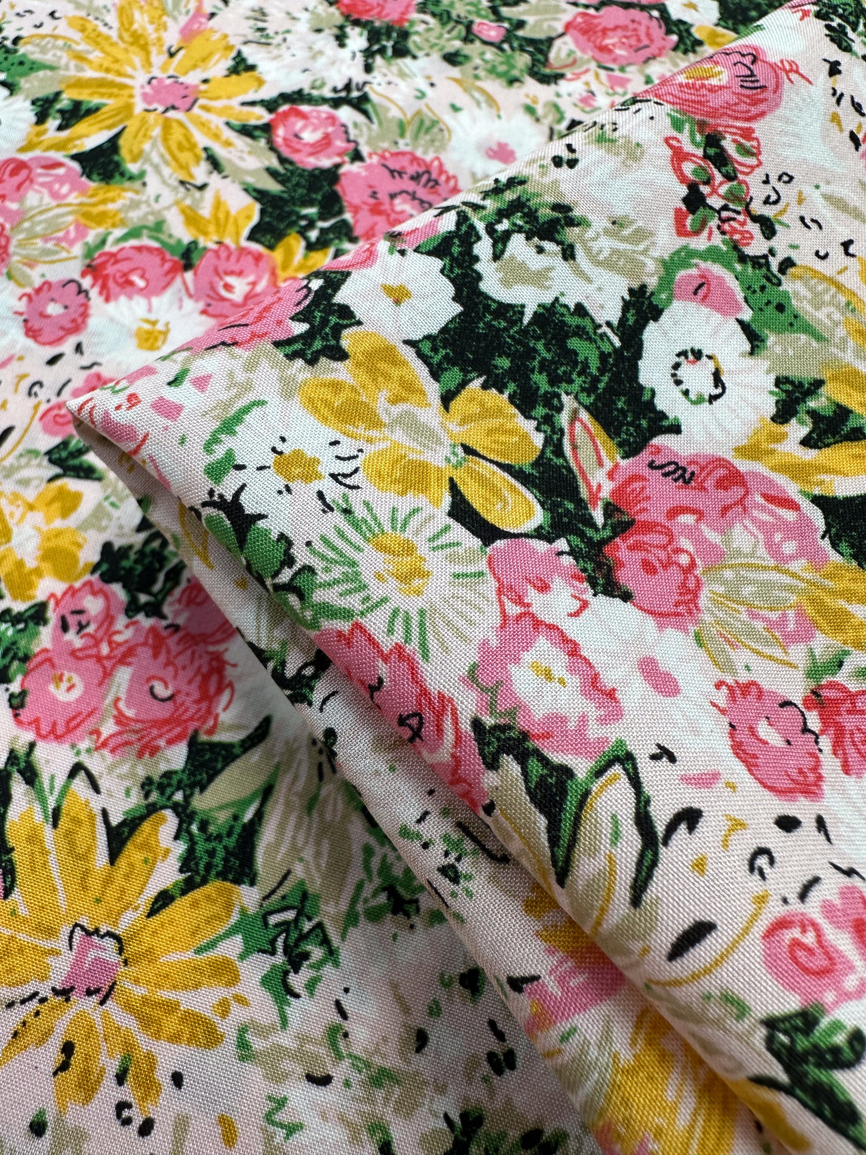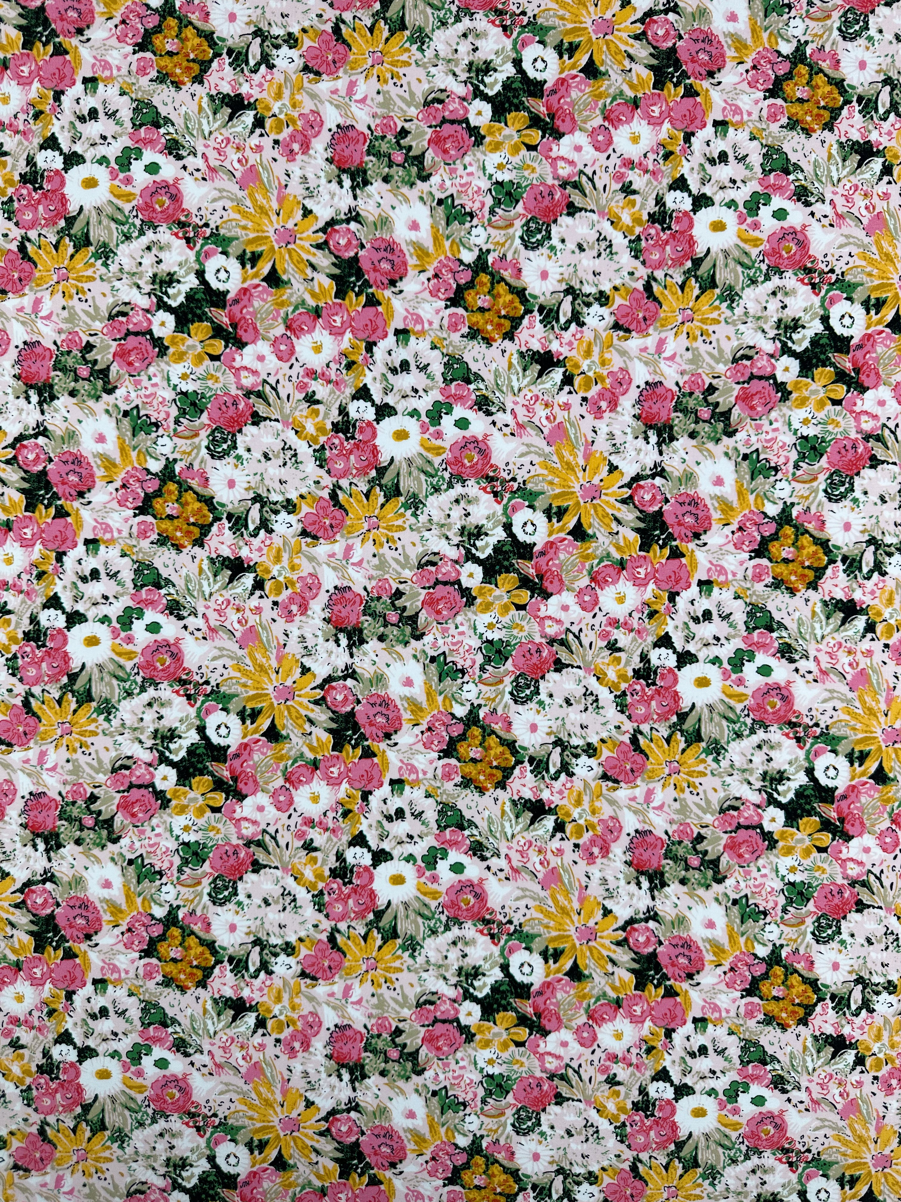The Designer Rayon - Floral Garden (145cm) from Super Cheap Fabrics features a vibrant, densely packed floral print—pink, white, and yellow blooms with green foliage—perfect for lively, colorful designs.