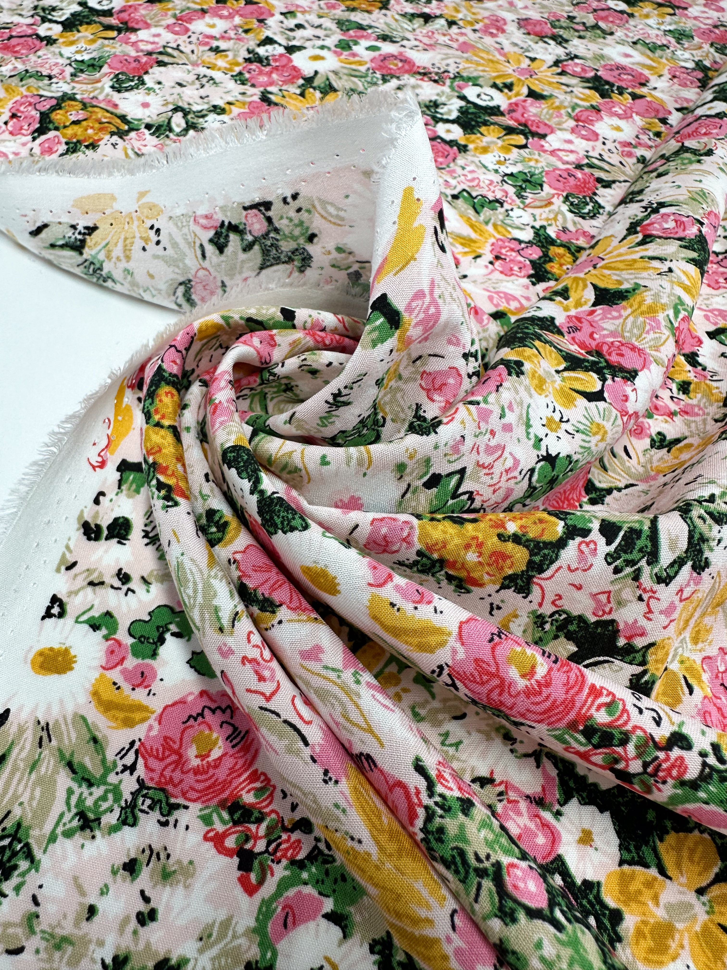 A close-up of Designer Rayon - Floral Garden by Super Cheap Fabrics shows vibrant yellow, pink, and white flowers with green leaves on a light background. Its lively print and soft drape make it a versatile 145cm-wide fabric for many projects.
