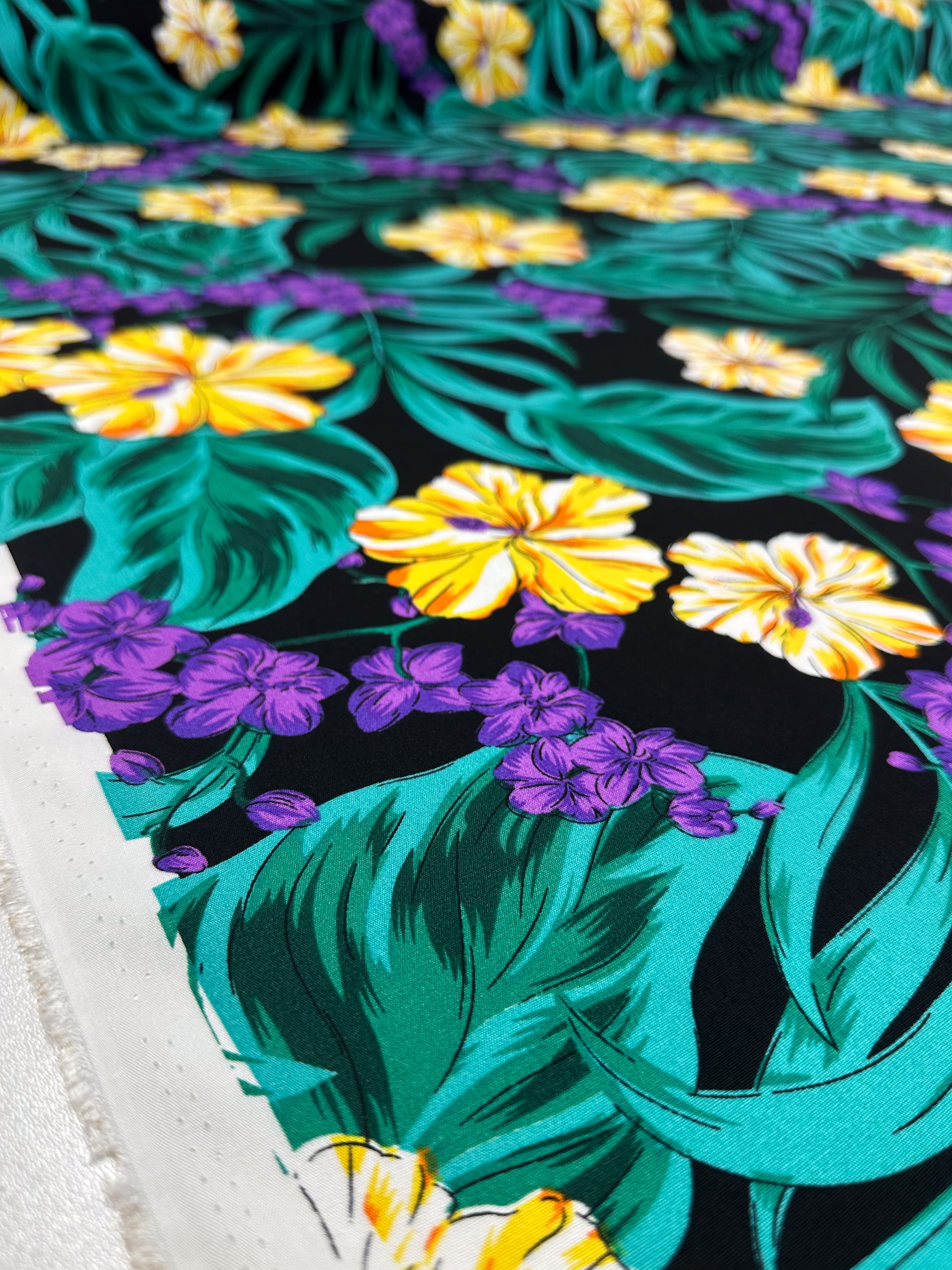 Super Cheap Fabrics' Designer Rayon - Neon Canopy - 145cm features yellow and orange hibiscus, small purple flowers, and green leaves on black—ideal for vibrant, lightweight projects.