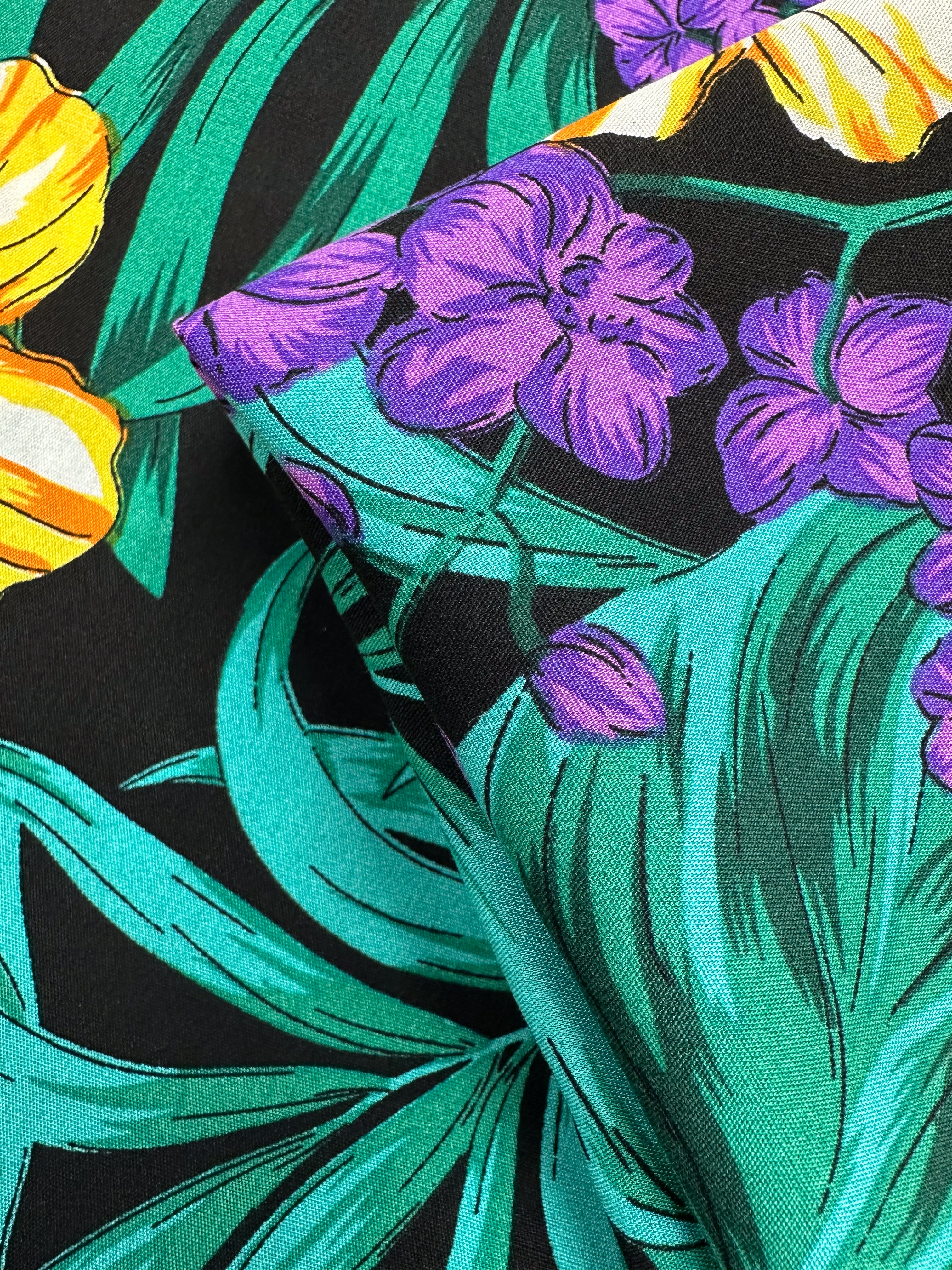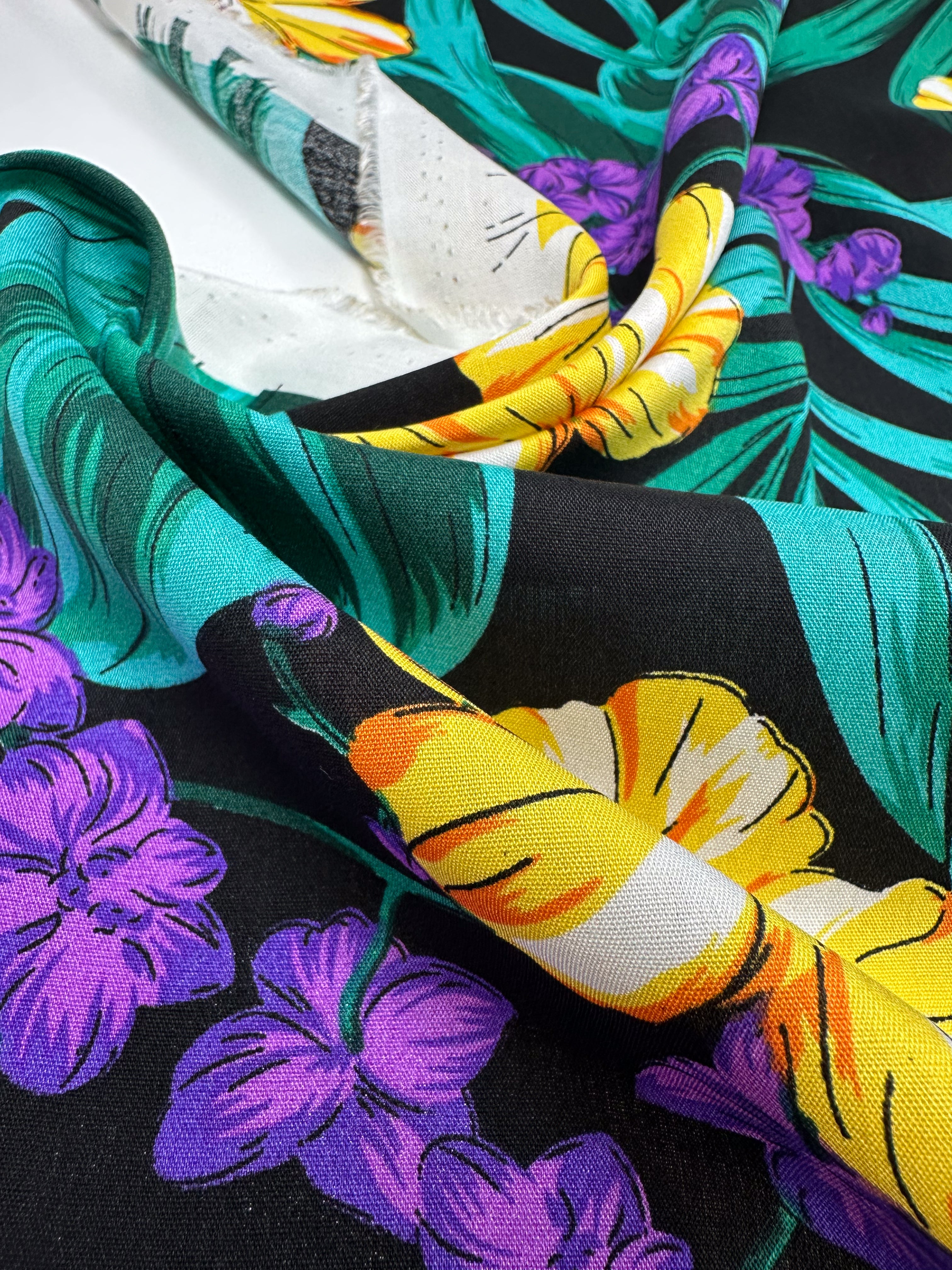 A close-up of Super Cheap Fabrics' Designer Rayon - Neon Canopy (145cm), featuring a lightweight rayon with tropical yellow and white flowers, purple orchids, and teal leaves on black, partially folded to show both front and back.