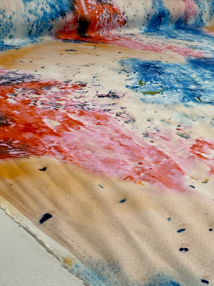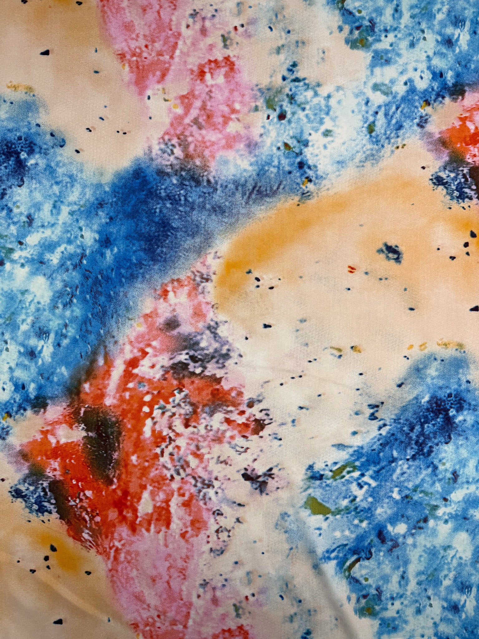 A soft cream base with abstract splashes of blue, coral, and sand tones.