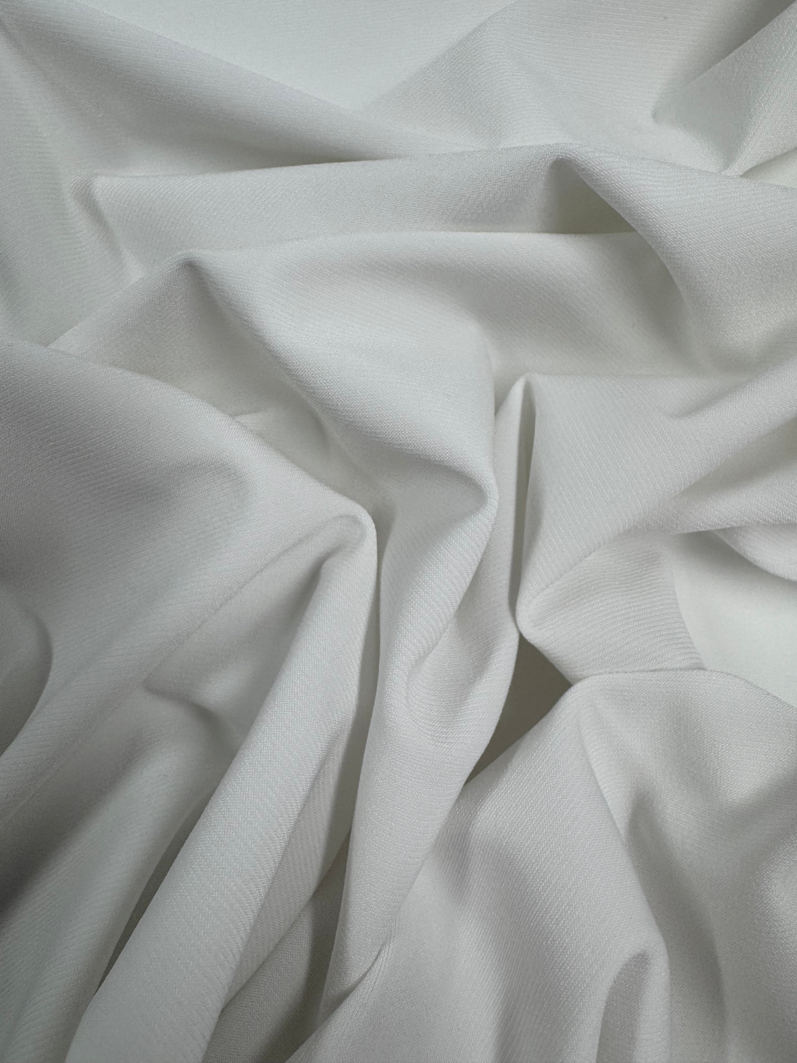 A beautiful plain, ivory-coloured interlock twist yarn fabric. This opaque fabric has been knit to have great elasticity and a soft touch. This medium weight fabric is the perfect weight for tops, dresses skirts and loose pants.
