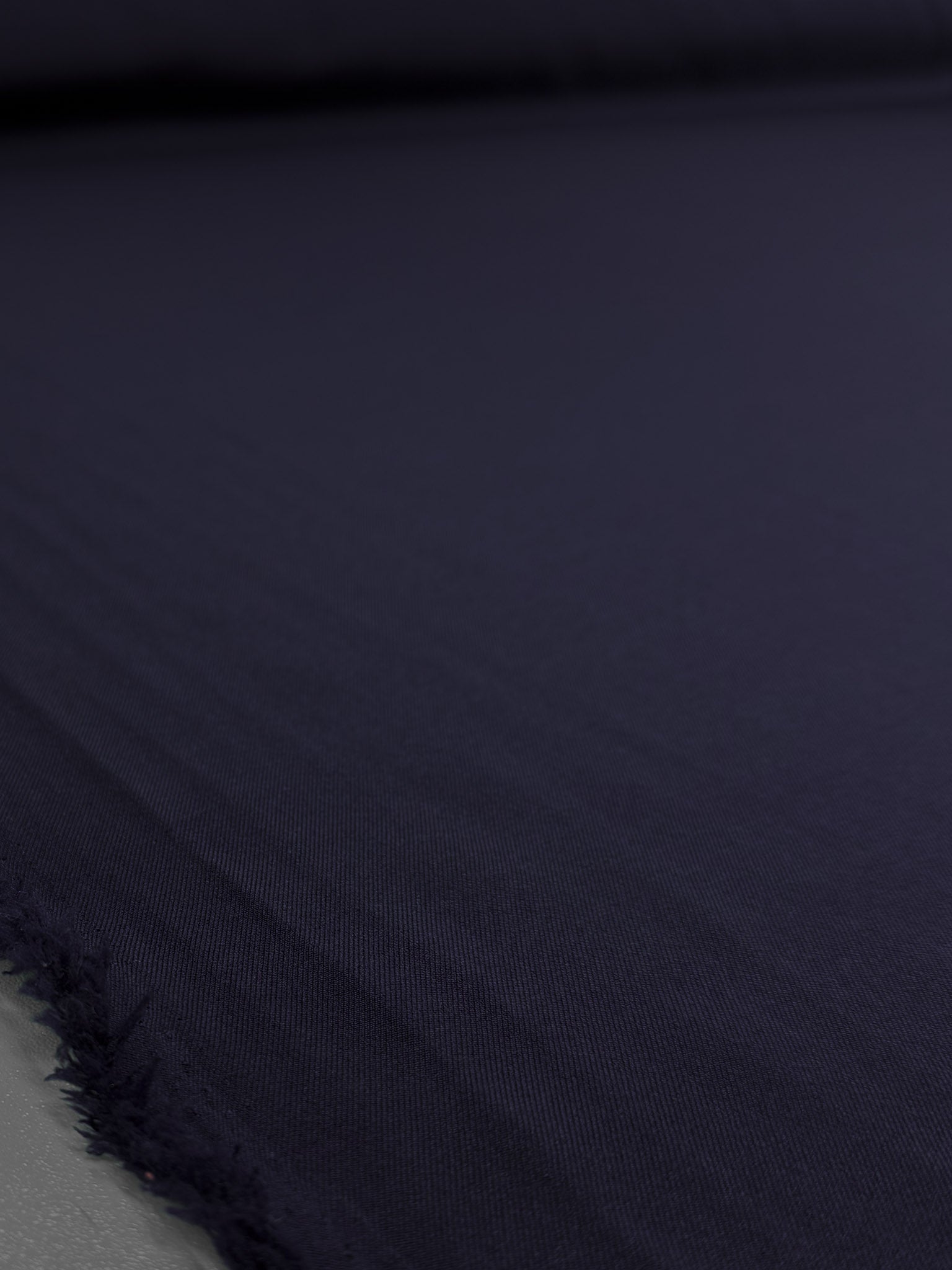 A close-up of Super Cheap Fabrics' Liquid Twill - Black Iris (150cm), laid flat to show its dark navy hue, subtle texture, and frayed edge in the foreground.