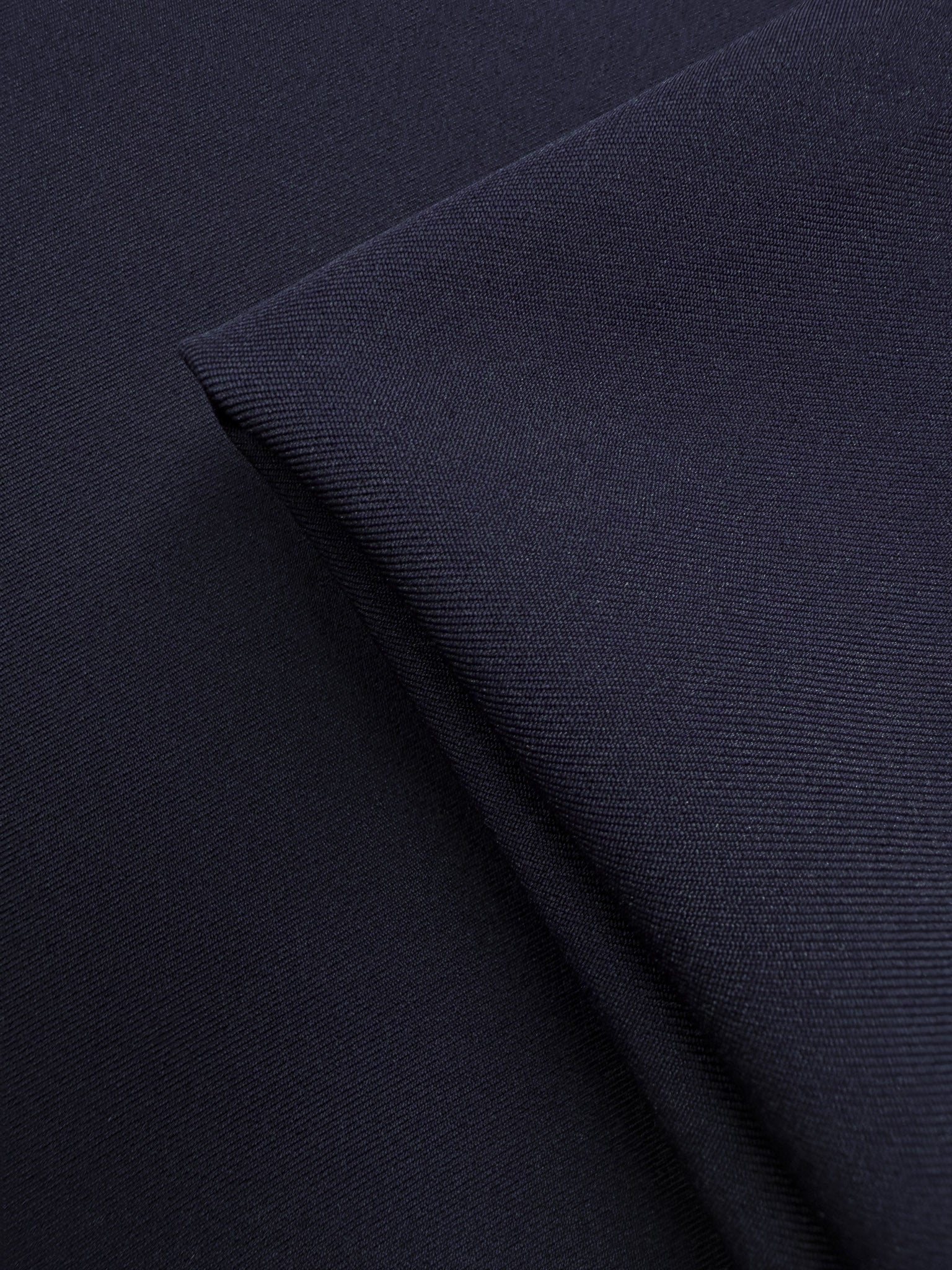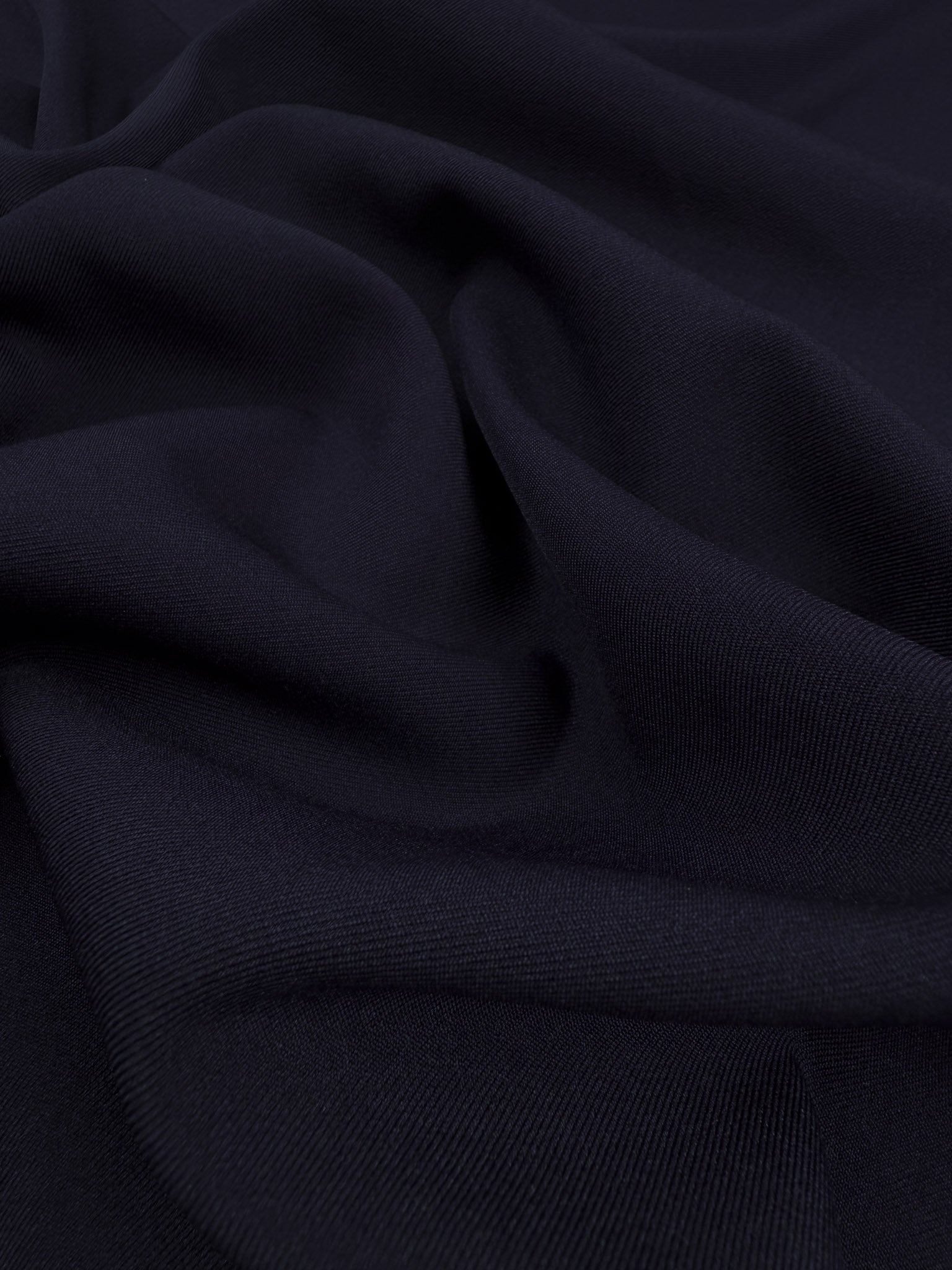 A close-up of Super Cheap Fabrics’ Liquid Twill - Black Iris (150cm) shows dark navy fabric with soft folds and a smooth, subtly textured surface, highlighting the refined quality of polyester.