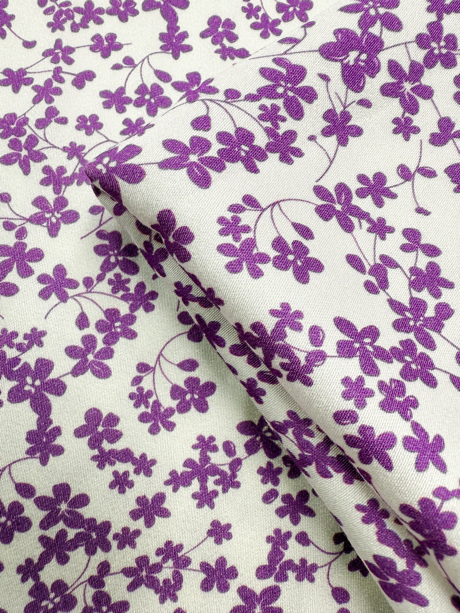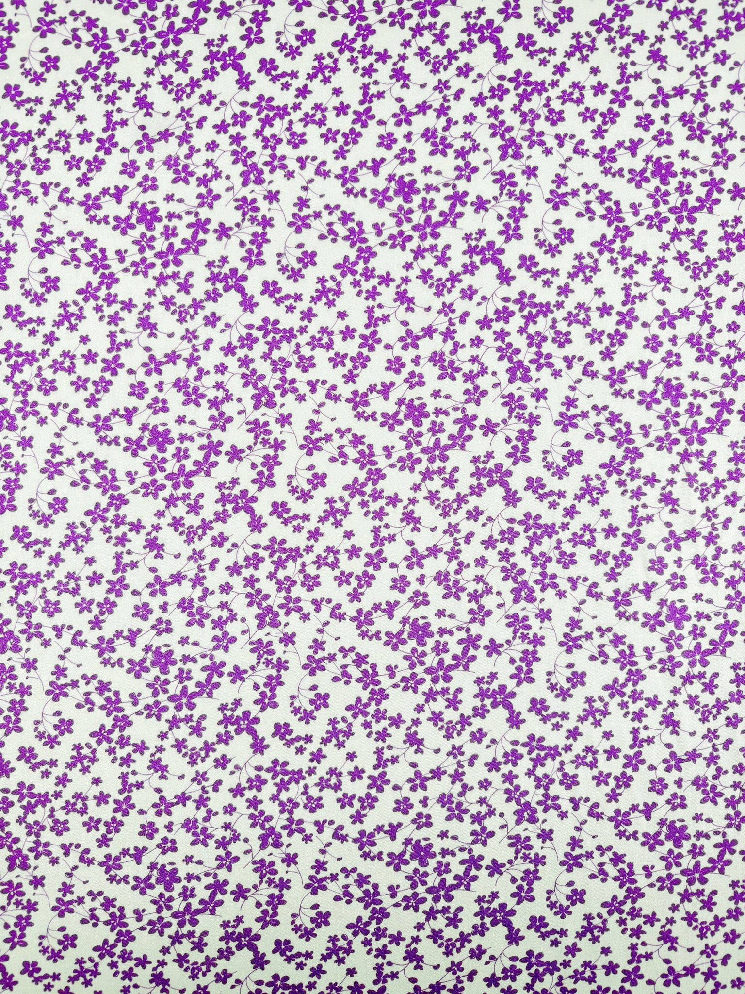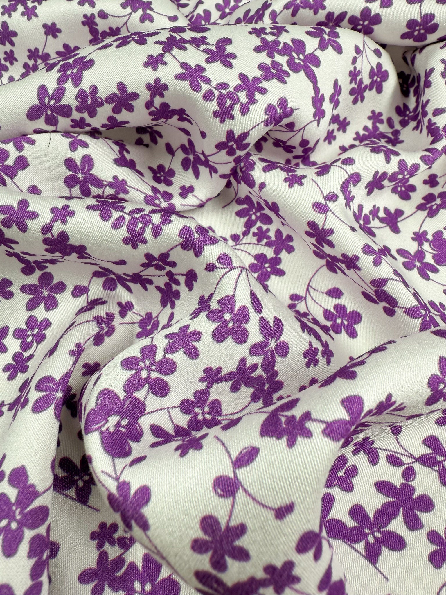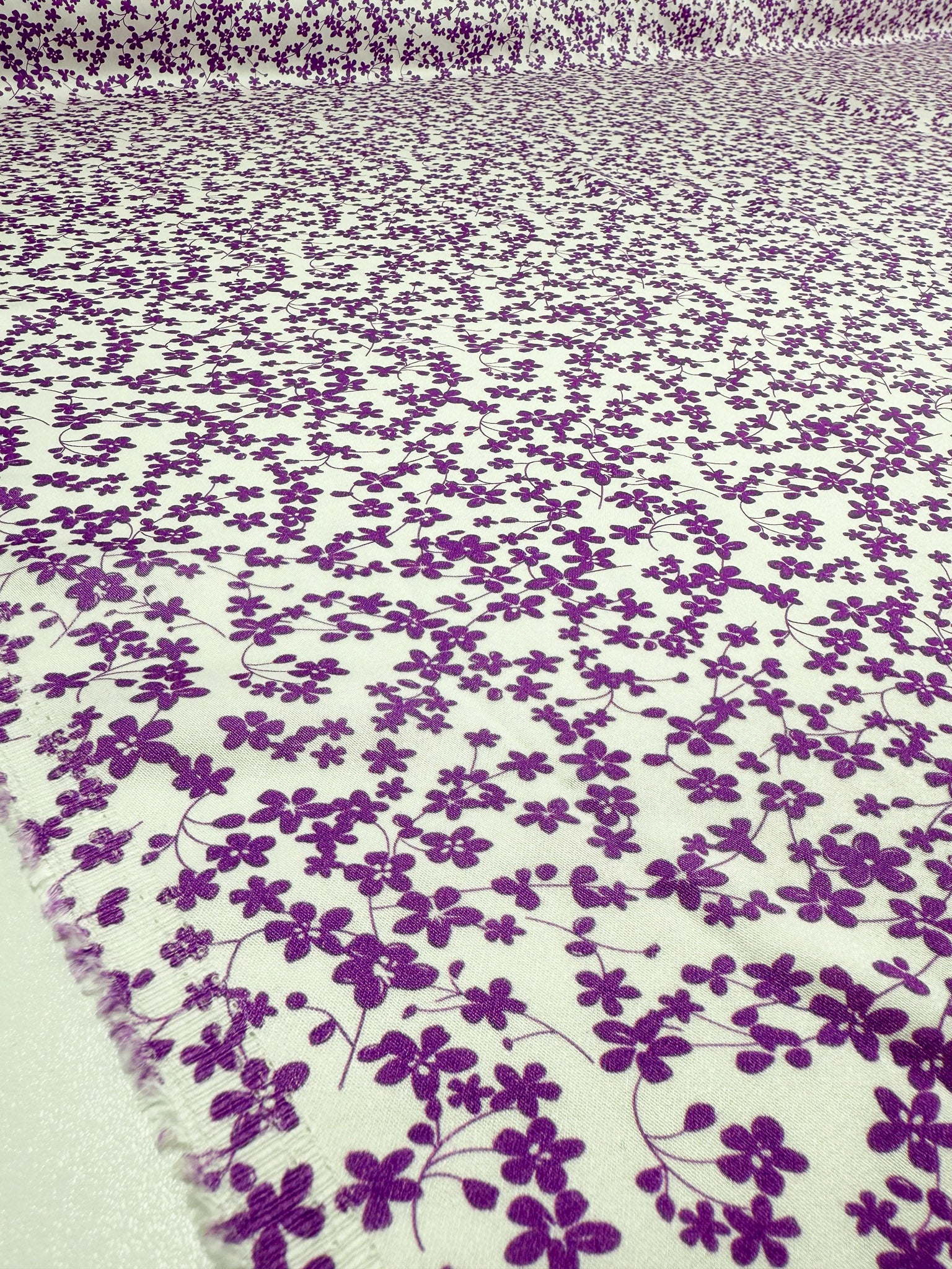 Mercerised Rayon - Violet Meadow by Super Cheap Fabrics is a white, breathable fabric featuring densely scattered purple flowers and vines. Vibrant floral design with slightly frayed edges. Width: 150cm.