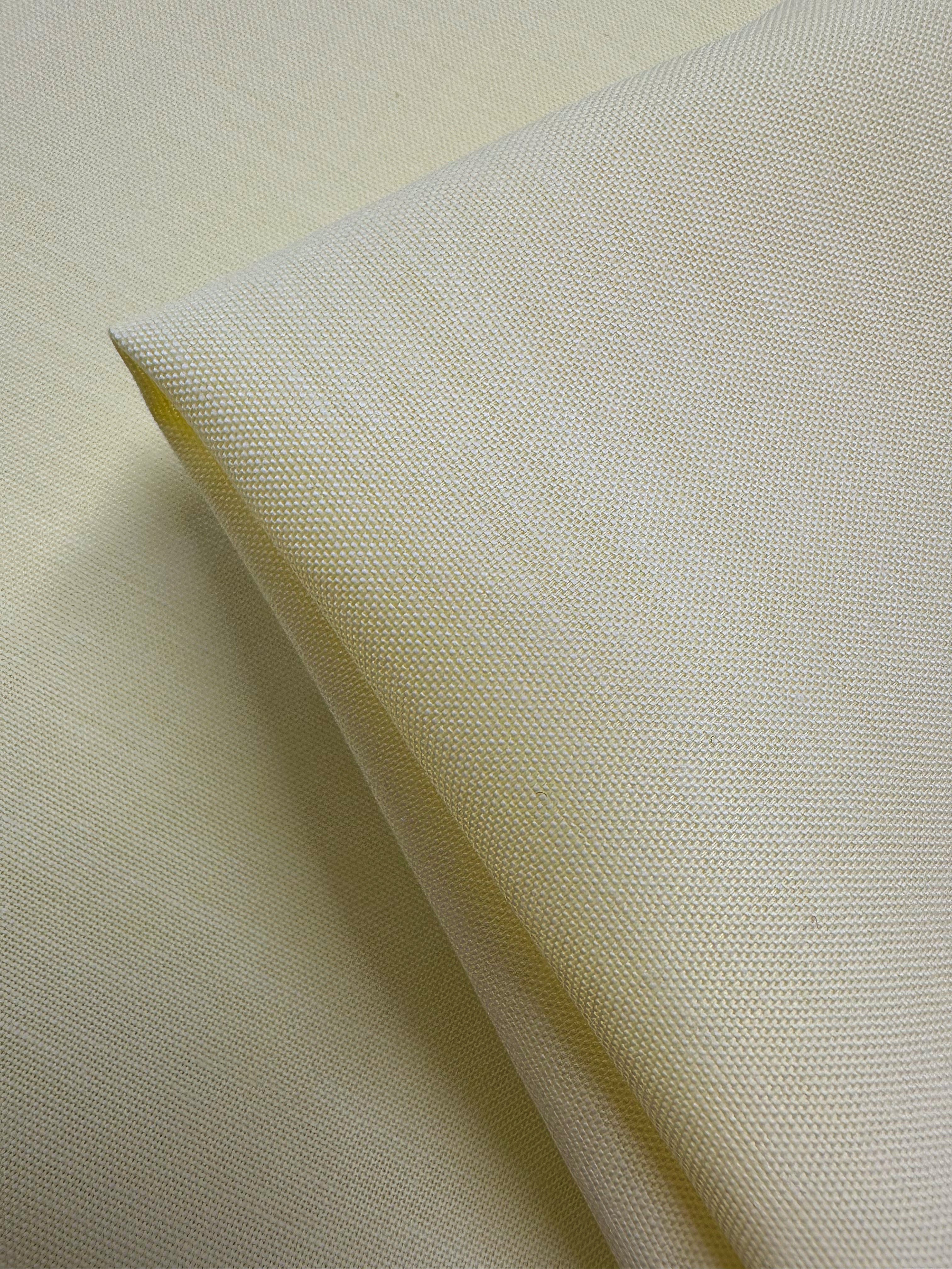 A close-up of Super Cheap Fabrics' Oxford Cotton - Lemon (146cm) shows its pale yellow hue and subtle texture, loosely gathered into a swirl to display both the smooth surface and unfinished white edge.