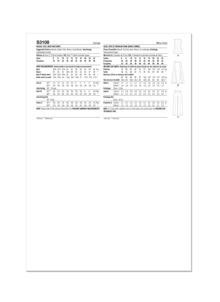 A semi-fitted, unlined vest features princess seams, front button closure, and decorative flaps. The flared, gored skirt includes a stitched hem. Views B and C showcase a contoured waistband, invisible side zipper, and finished hems. The wide-leg trousers are fitted through the hips and designed with side-front pockets.