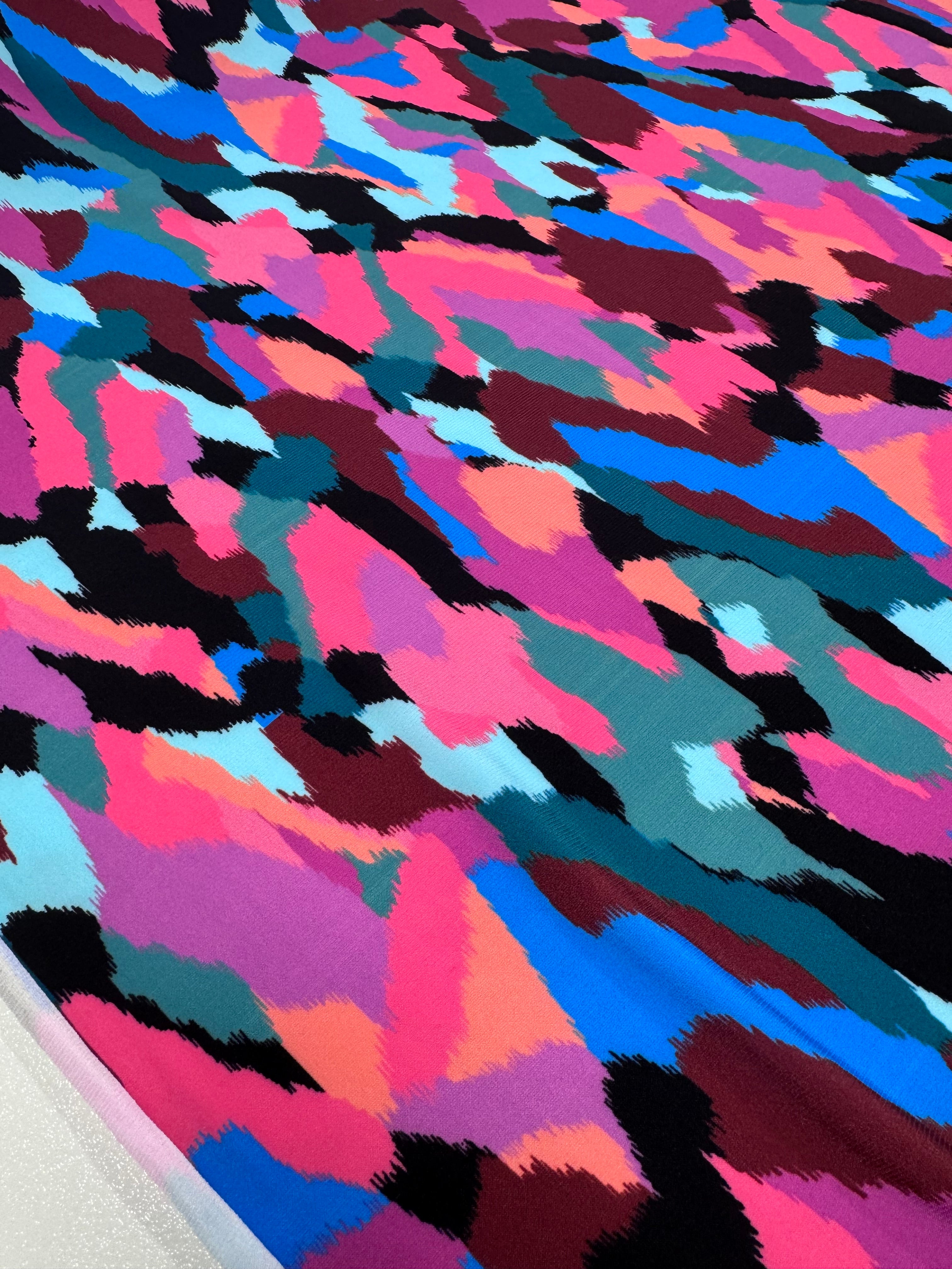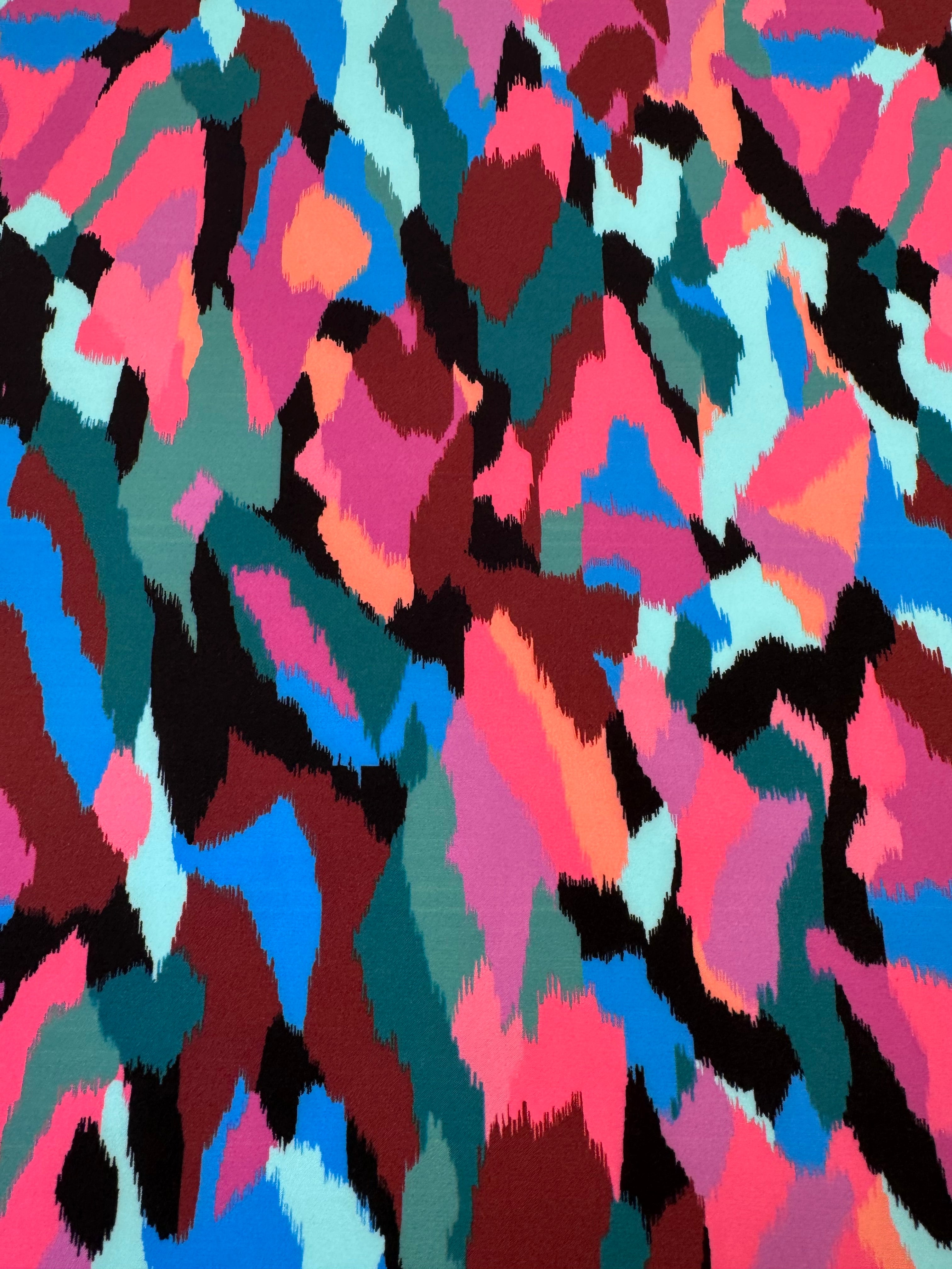 Our Printed Lycra is a Polyester/Spandex fabric that has a two-way stretch and comes in a variety of beautiful prints! Printed Lycra is a medium-weight fabric, has good durability and stretch, and washes well. Our Lycras are perfect for making tops, dresses, skirts, pants, accessories, and even childrenswear. An intricate multi-coloured paisley with teal, orange, pink, and green accents.