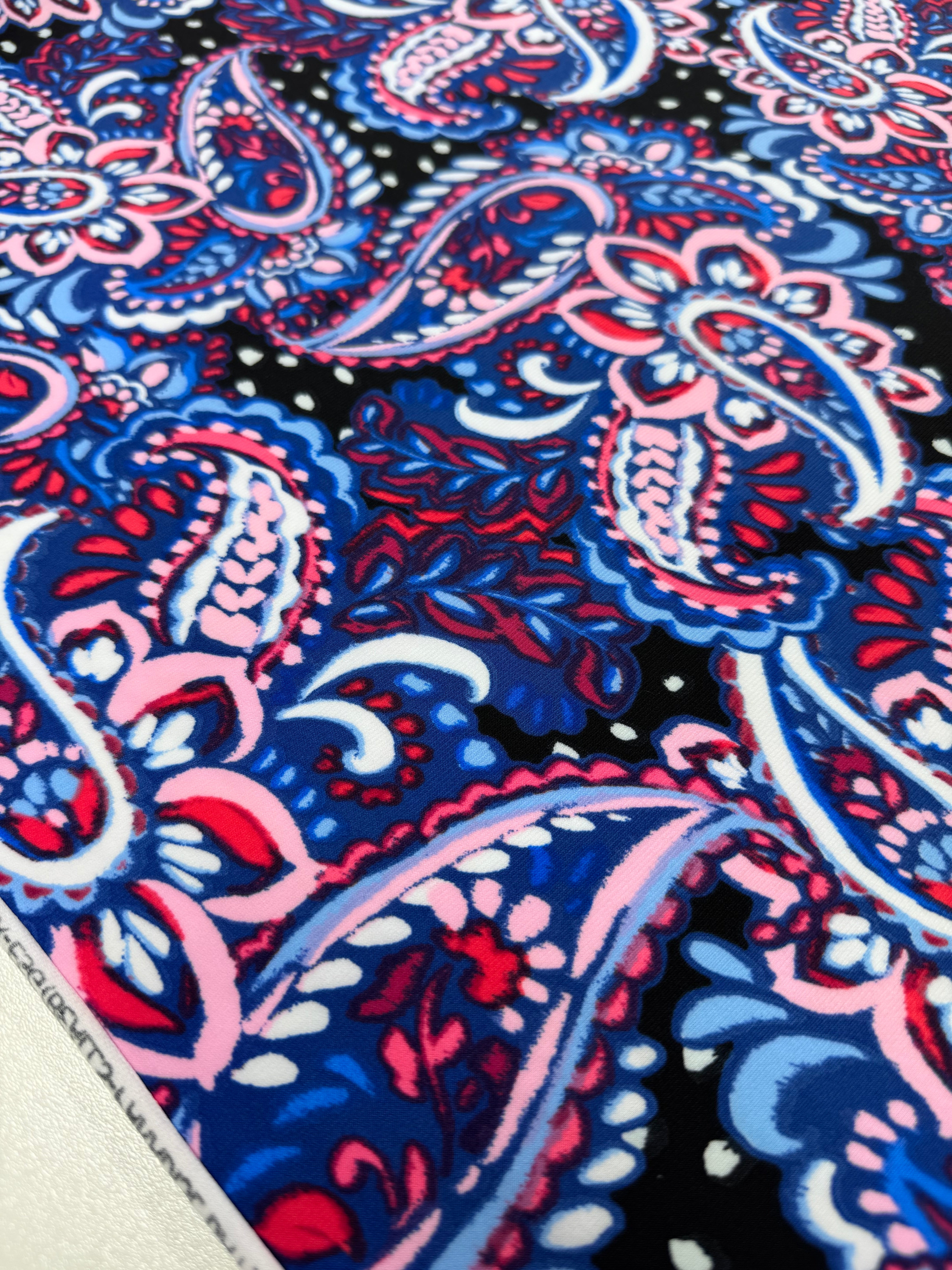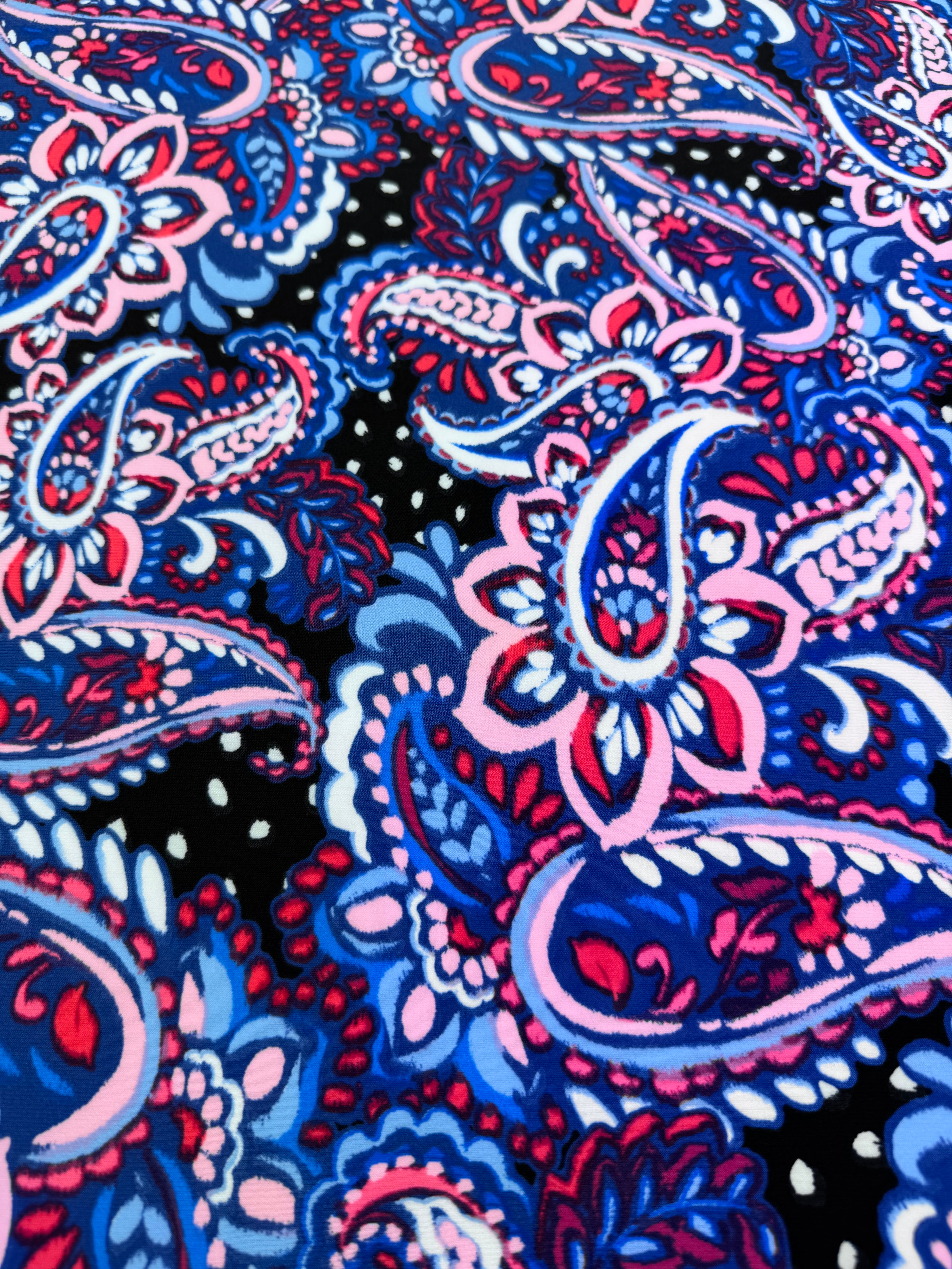 Our Printed Lycra is a Polyester/Spandex fabric that has a two-way stretch and comes in a variety of beautiful prints! Printed Lycra is a medium-weight fabric, has good durability and stretch, and washes well. Our Lycras are perfect for making tops, dresses, skirts, pants, accessories, and even childrenswear. An intricate multi-coloured paisley with teal, orange, pink, and green accents.