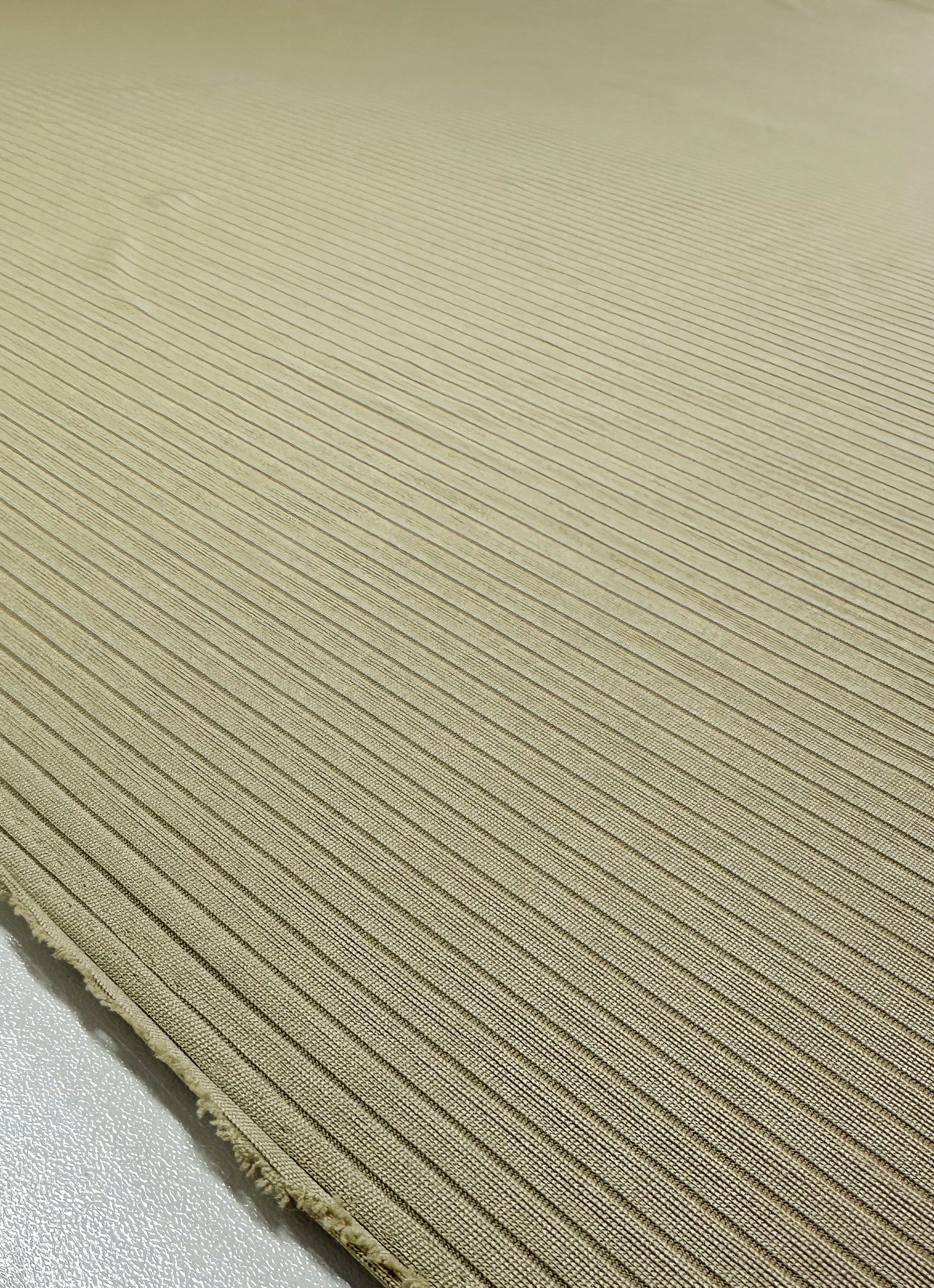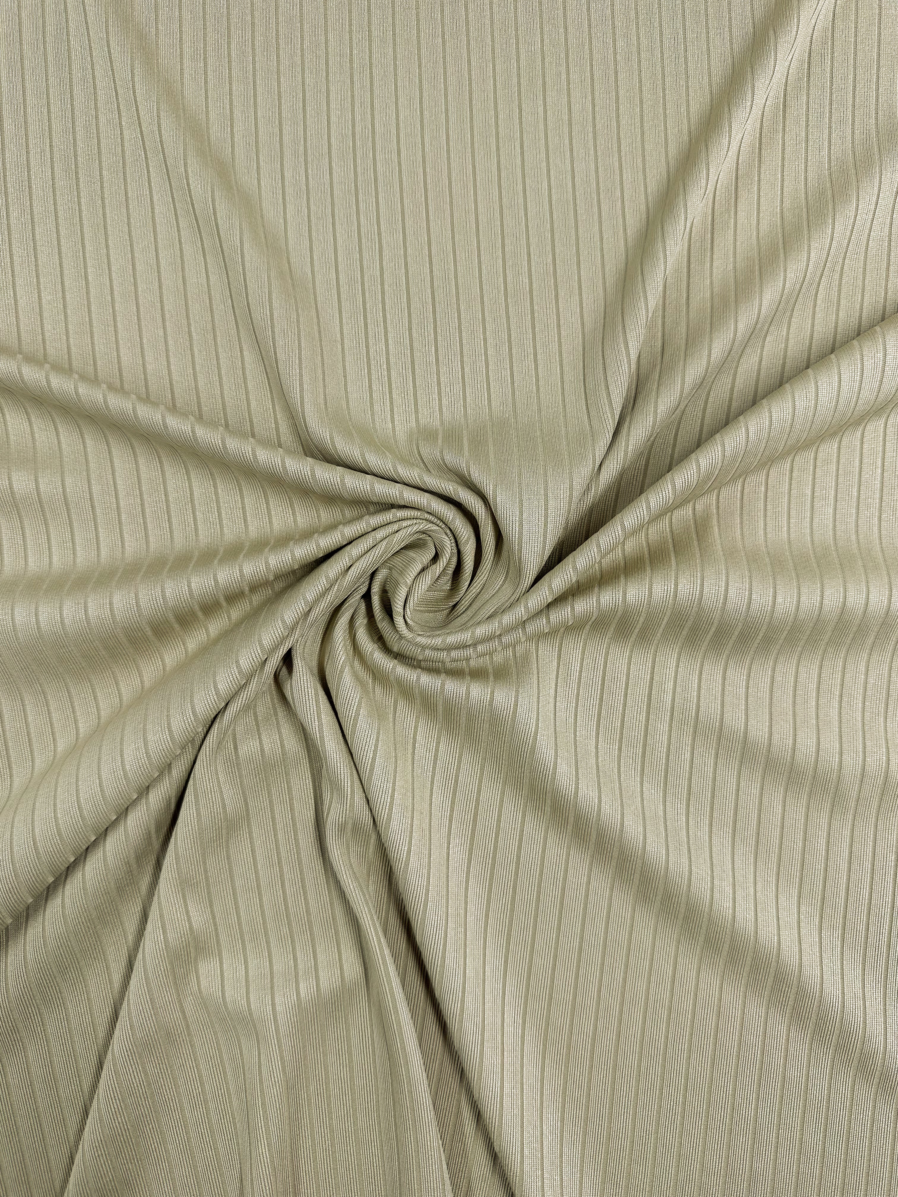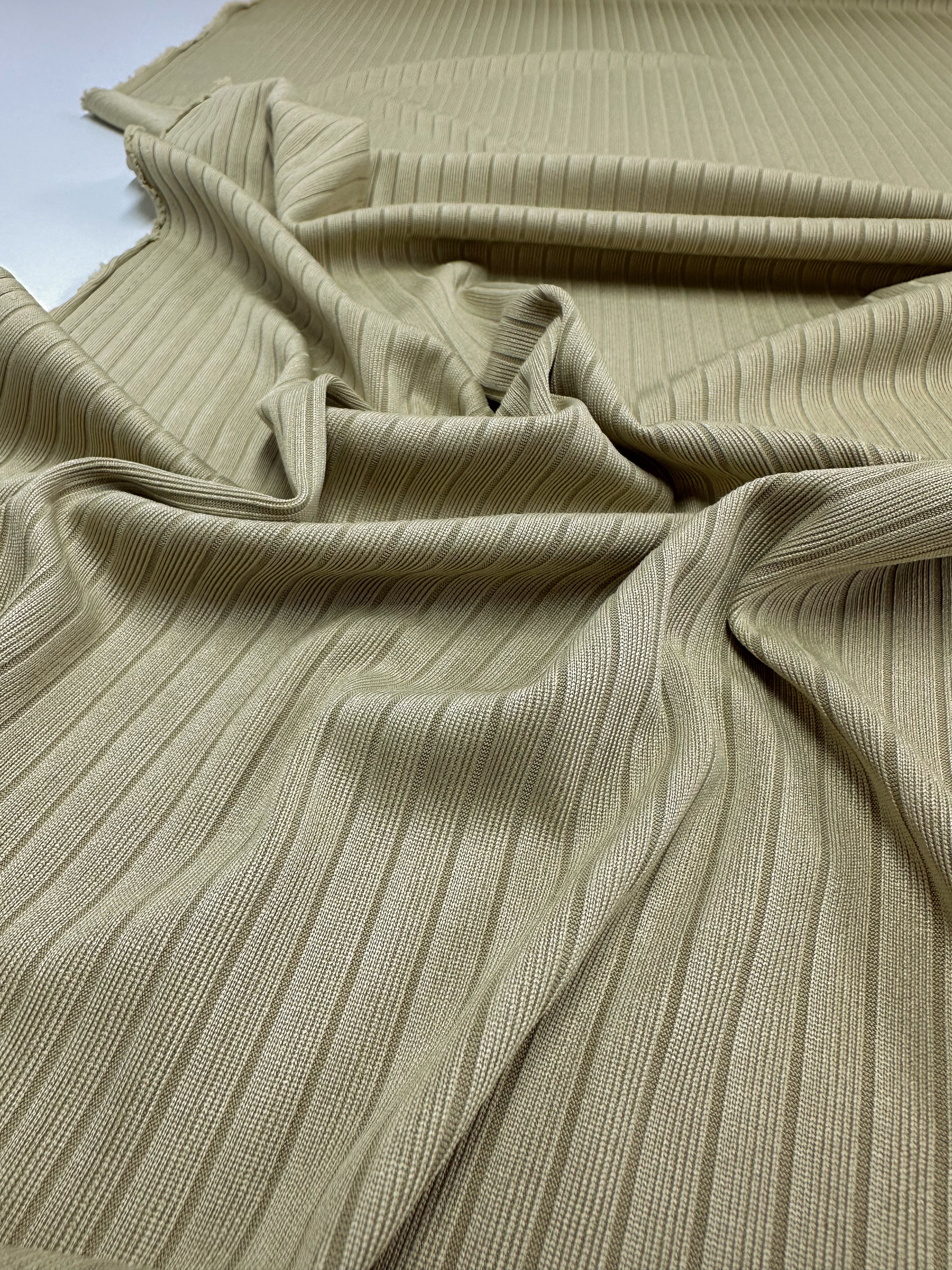 Super Cheap Fabrics' Rib Knit in Hay, 170cm wide, features soft folds of medium weight beige fabric with vertical ribbing for added structure and elegance.