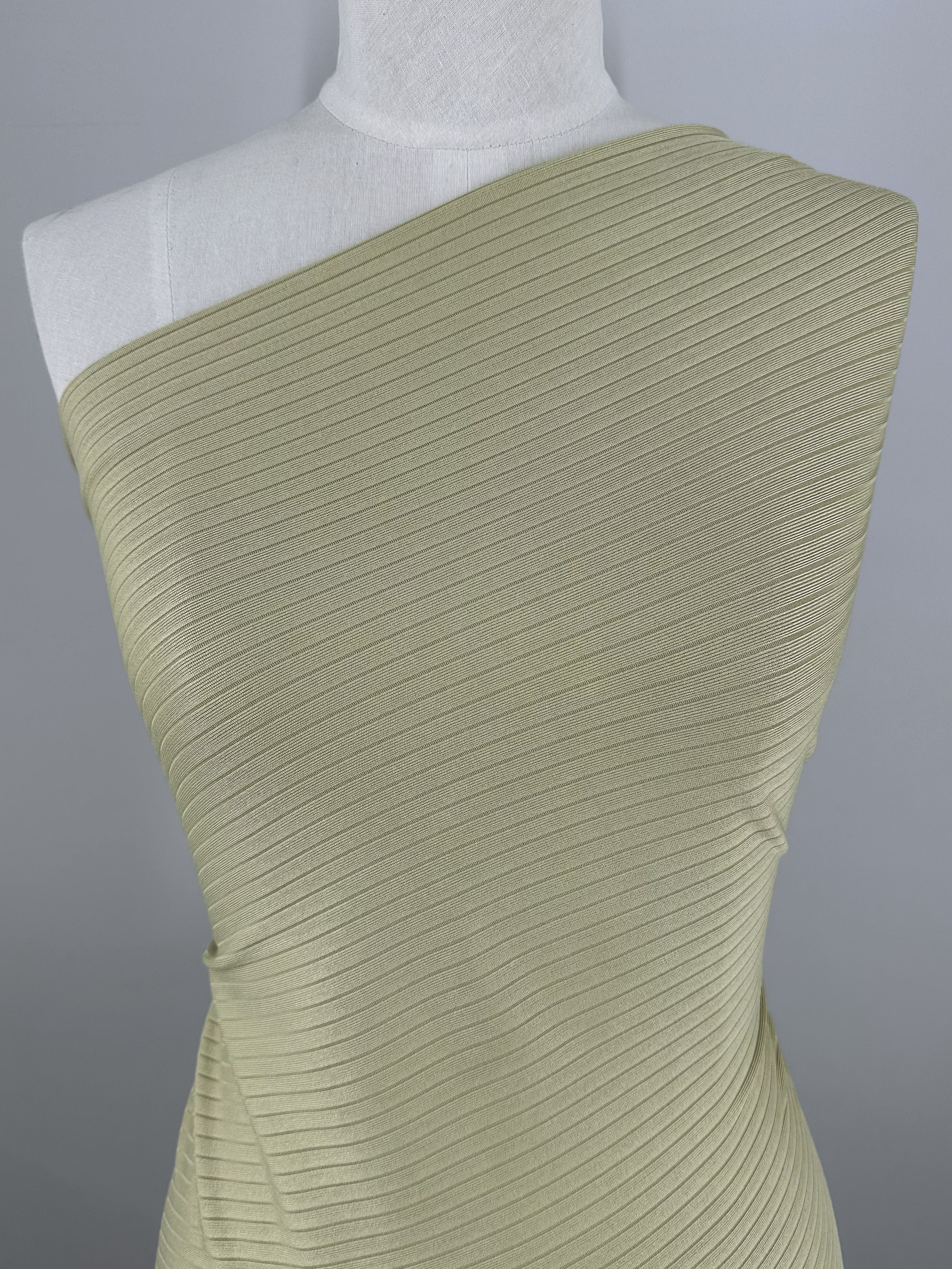A mannequin displays a one-shoulder dress crafted from Super Cheap Fabrics' Rib Knit in Hay, 170cm, exhibiting a form-fitting silhouette and horizontal ribbing against a neutral gray backdrop.