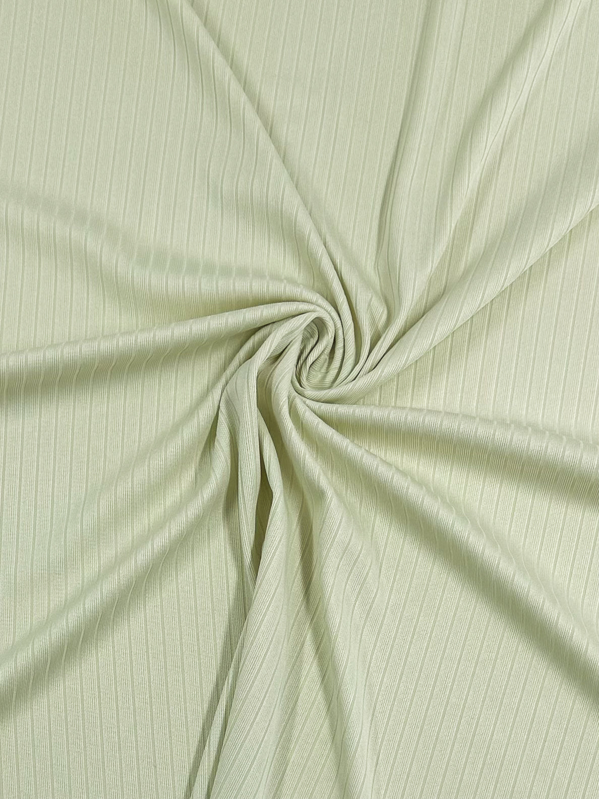 A close-up of Super Cheap Fabrics' Sylvan Green Rib Knit (175cm) displays its light green, medium-weight texture, featuring thin vertical lines. The fabric appears stretchy, comfortable, and subtly reflective with visible edges on one side.