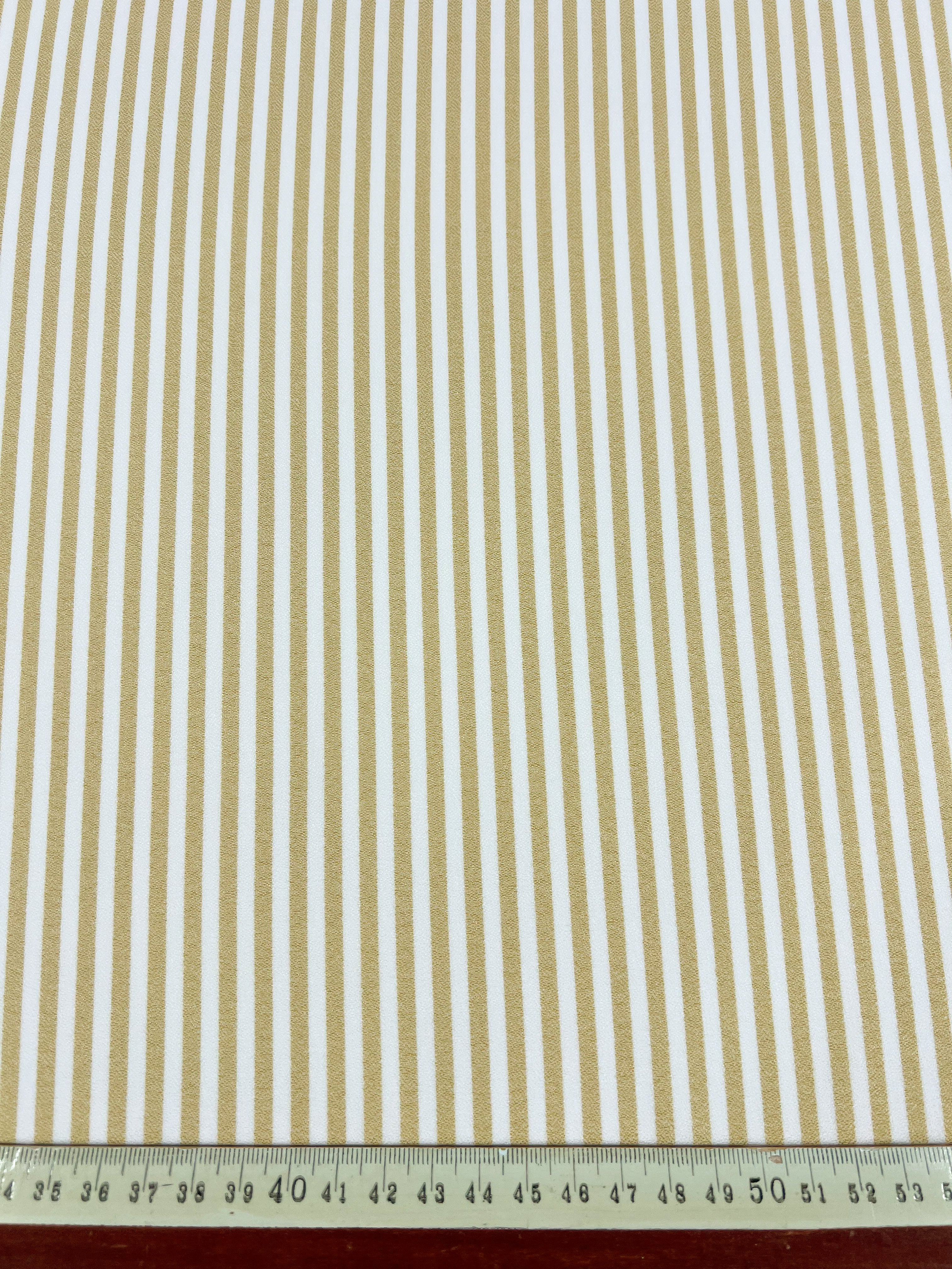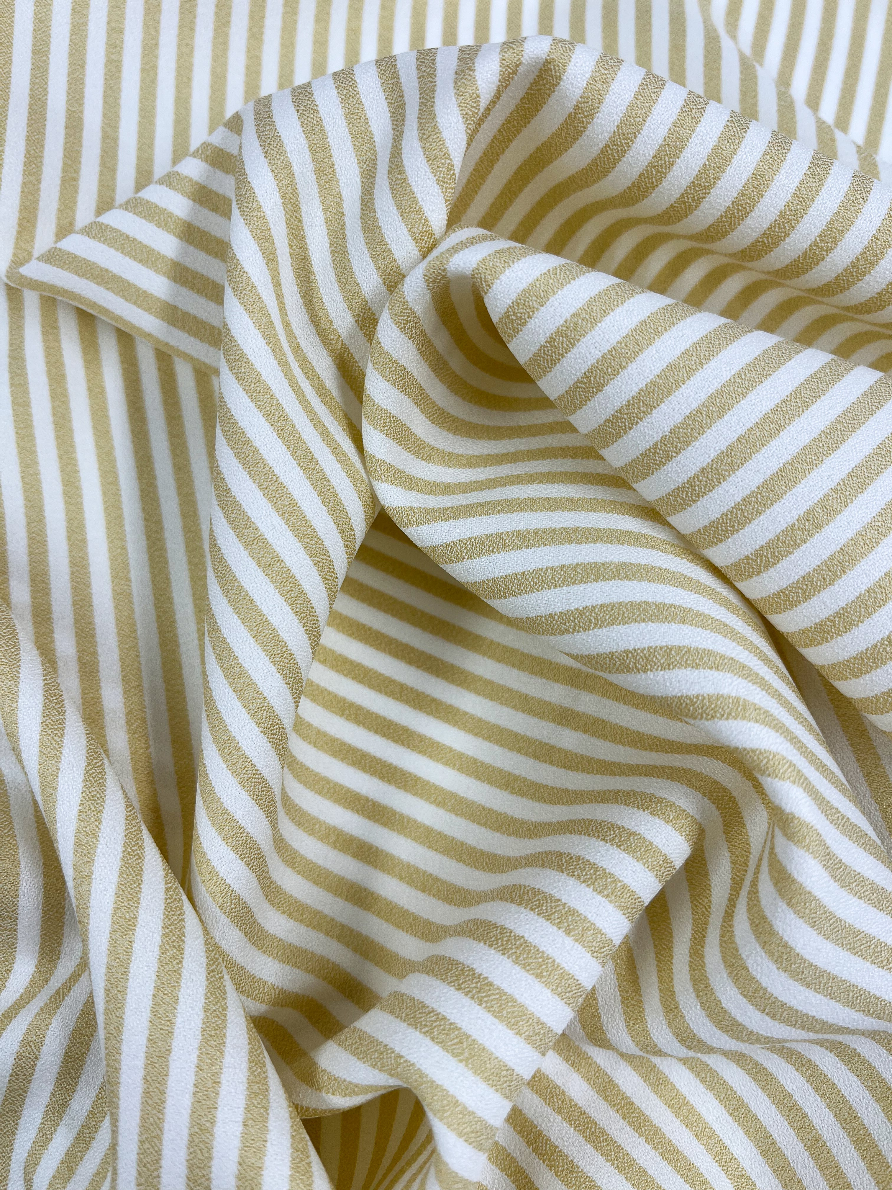 A close-up of Super Cheap Fabrics’ Striped Crepe - Raffia, 150cm wide, featuring beige and white vertical stripes and a smooth crepe texture—perfect for high fashion projects.