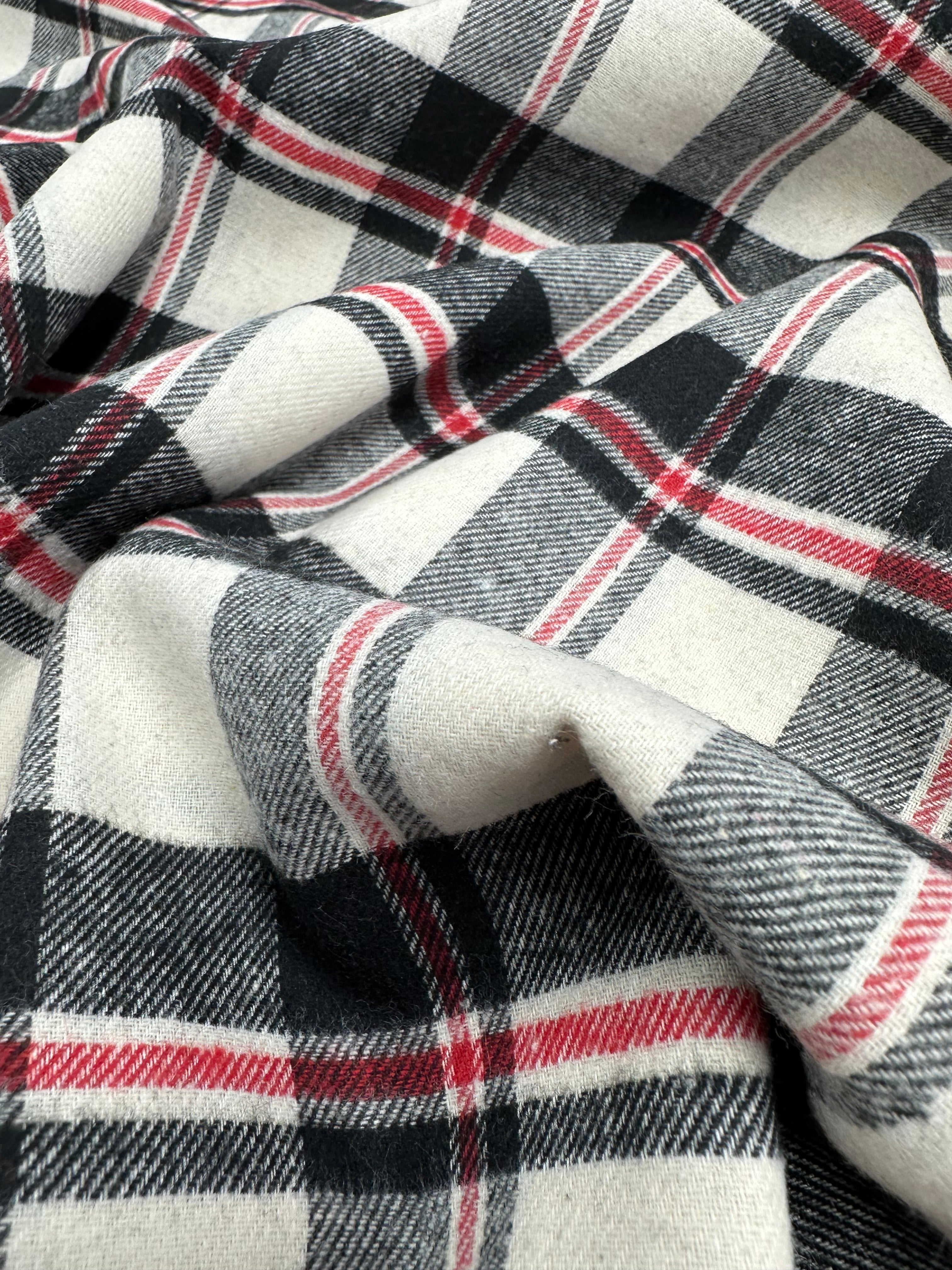A close-up of Super Cheap Fabrics' Suiting - Black Watch Plaid (147cm) shows its soft cotton polyester twill in black, white, red, and gray with crisp folds and detailed texture.