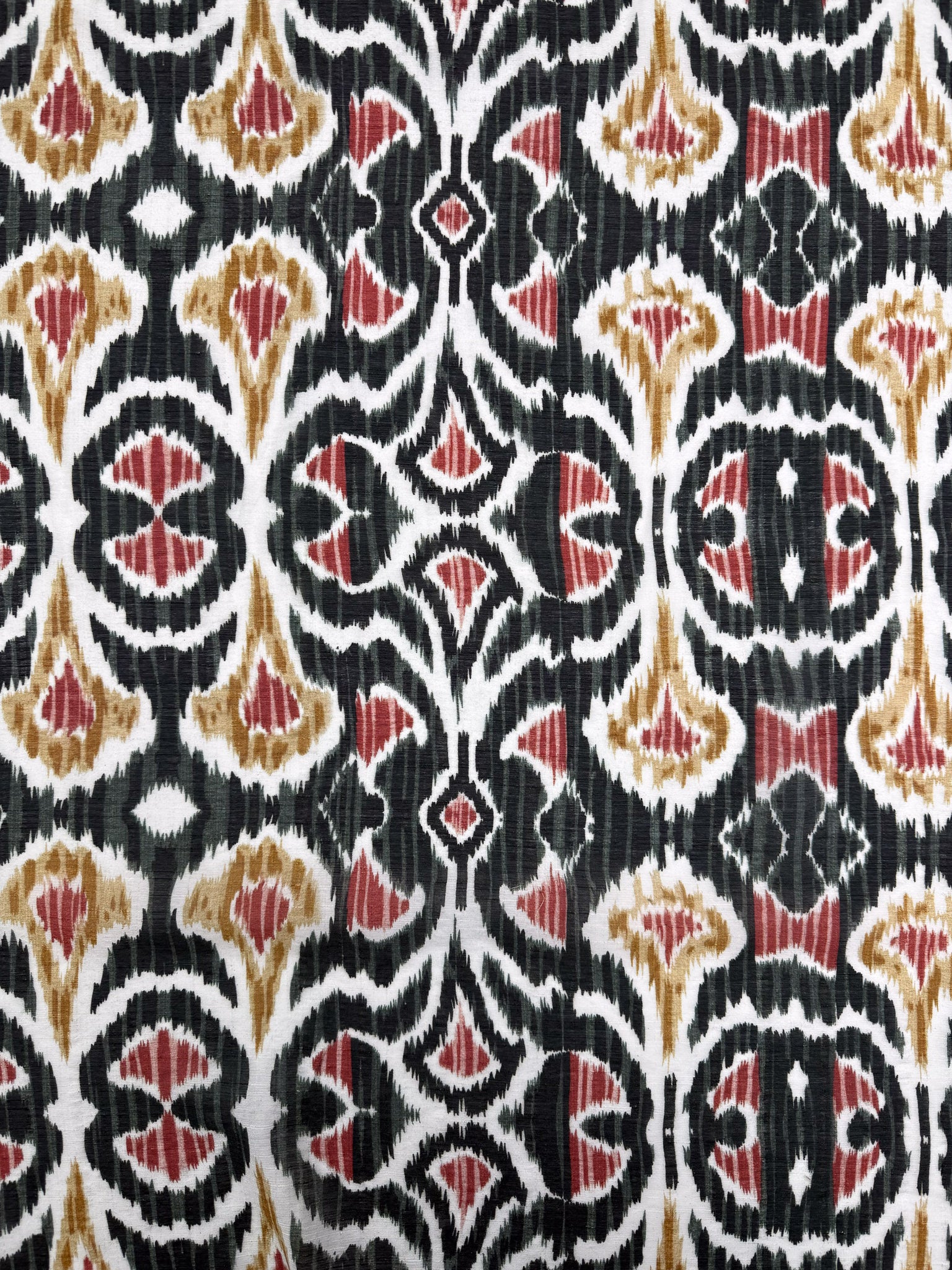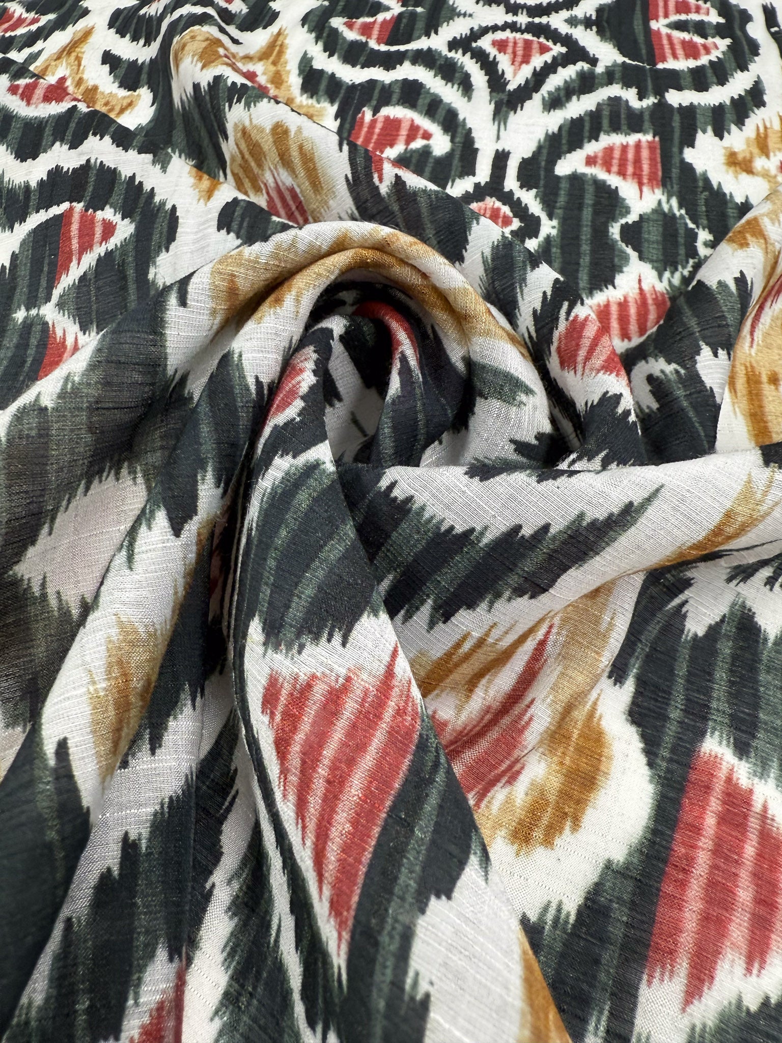 A close-up of Super Cheap Fabrics' Textured Designer Cotton - Spice Loom (150cm), showing a swirling fold with black, white, red, and brown abstract Ikat-style patterns.