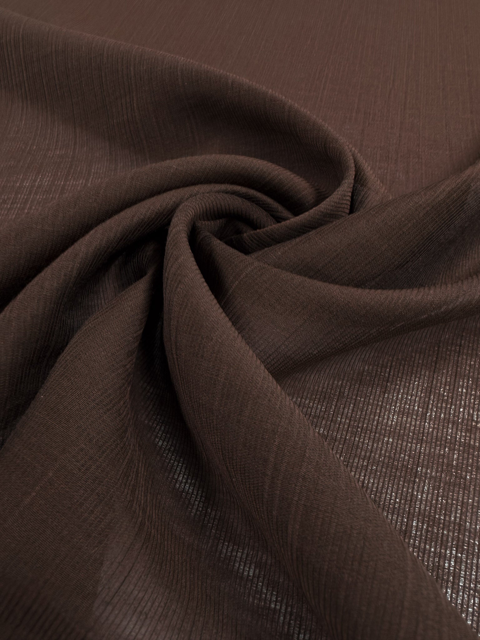 Close-up of Super Cheap Fabrics’ Textured Designer Voile - French Roast - 155cm, featuring soft brown fabric gathered at the center for swirling folds and gentle texture, allowing light to softly filter through.