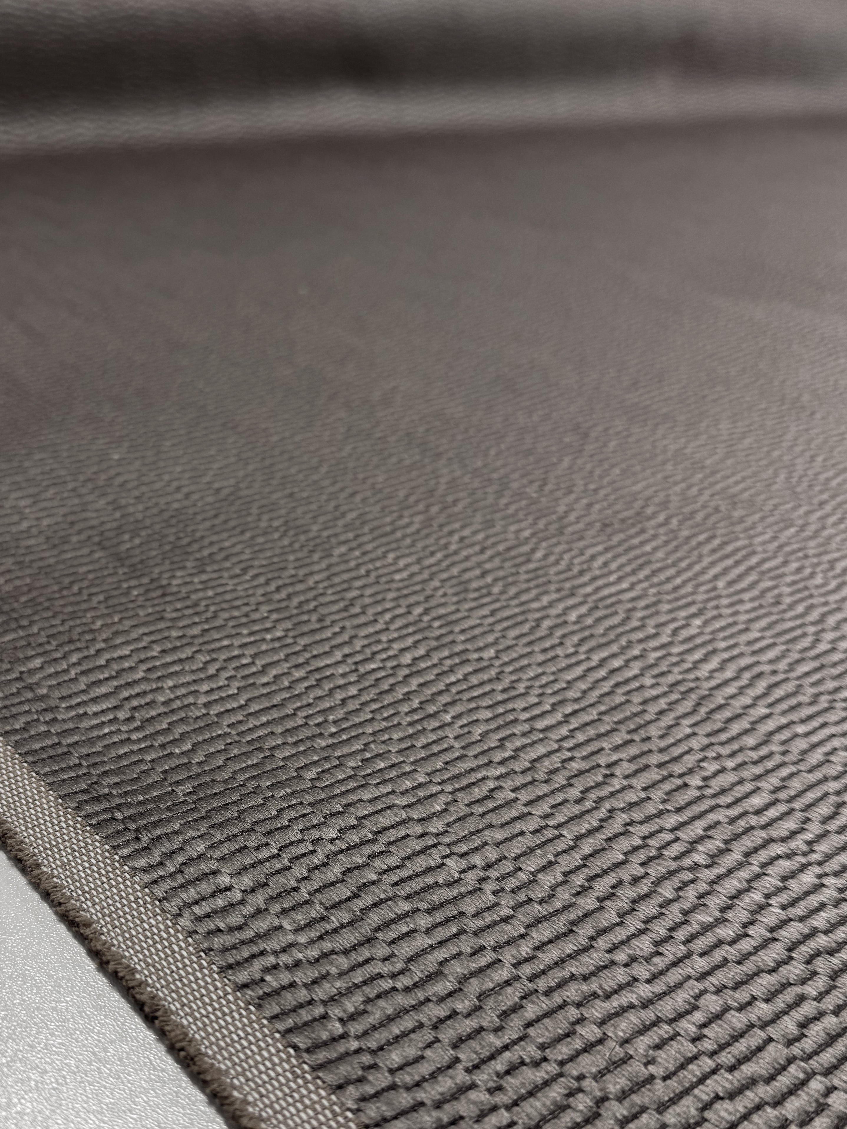 Close-up of Super Cheap Fabrics' Upholstery Jacquard - Oscar Putty (148cm), showing its textured dark gray surface, fine ridges, subtle pattern, heavy weight feel, and fabric border along the edge.