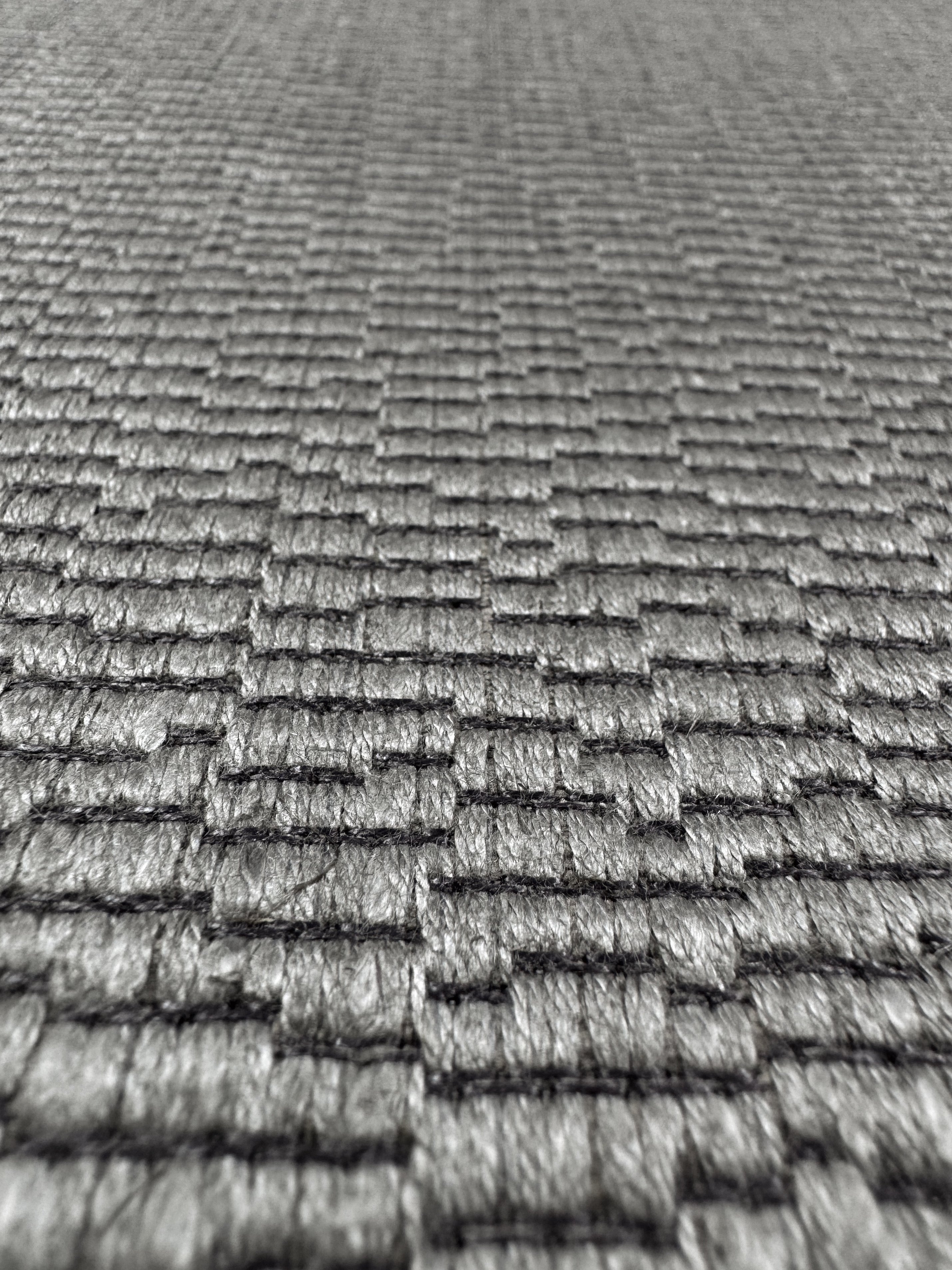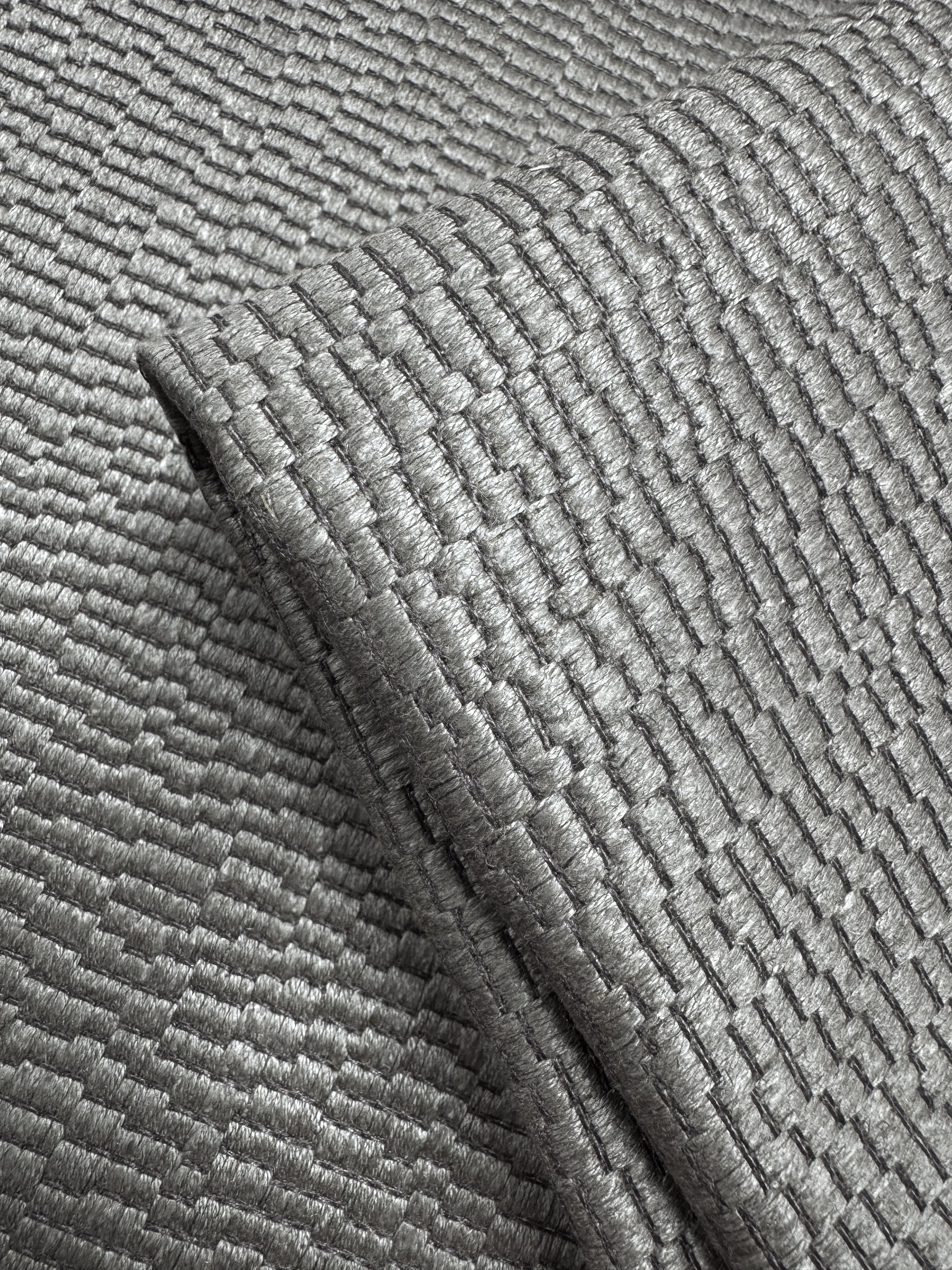 Close-up of Super Cheap Fabrics' Upholstery Jacquard - Oscar Putty (148cm): a shiny, silver-gray heavyweight fabric with a geometric basket-weave pattern that reflects light, showcasing its intricate weave and metallic look.
