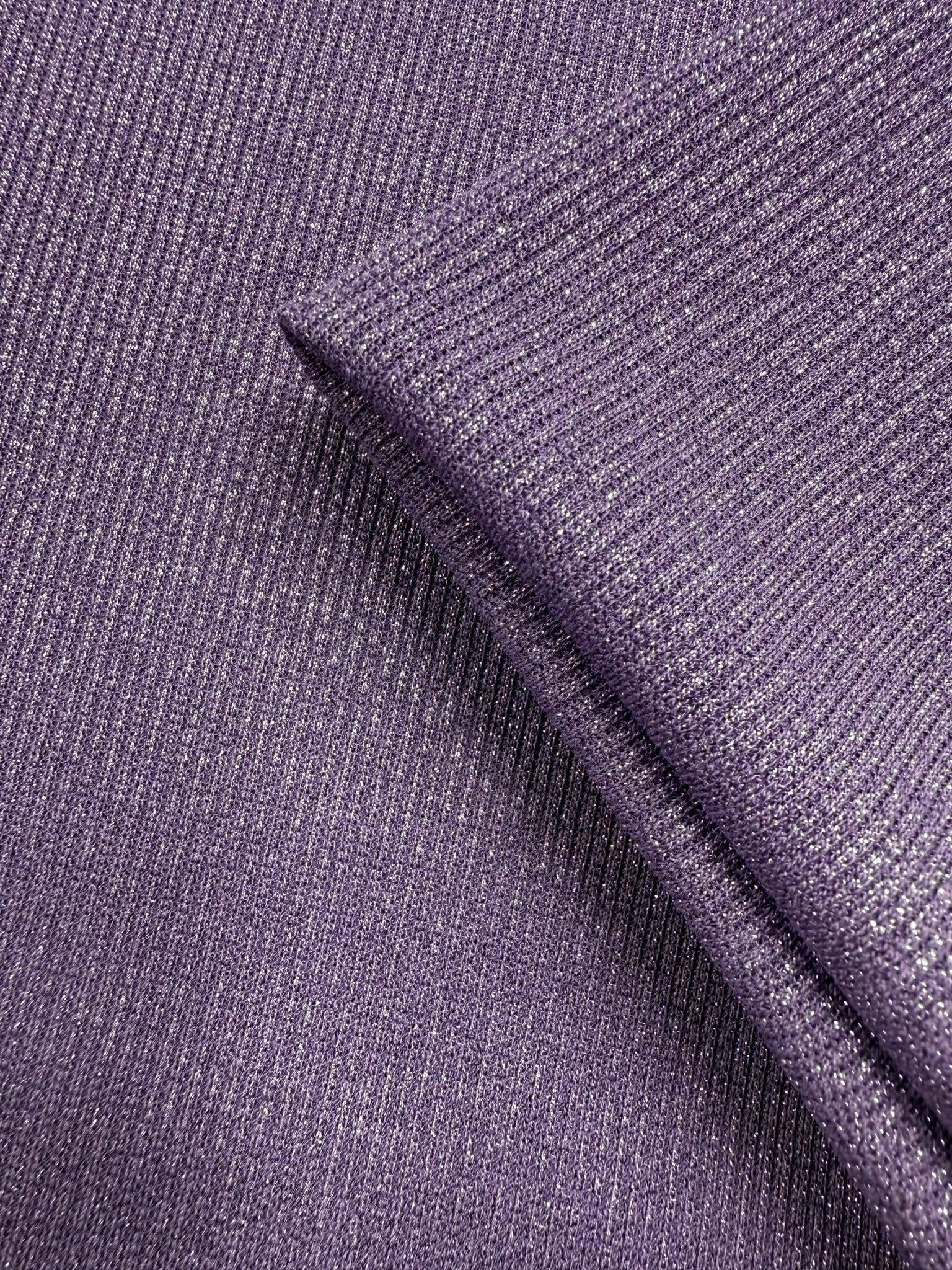 A rich viscose lurex knit with a subtle shimmer and soft, fluid drape. Lightweight and comfortable, this ribbed Knit is ideal for elegant tops, dresses, and relaxed eveningwear.