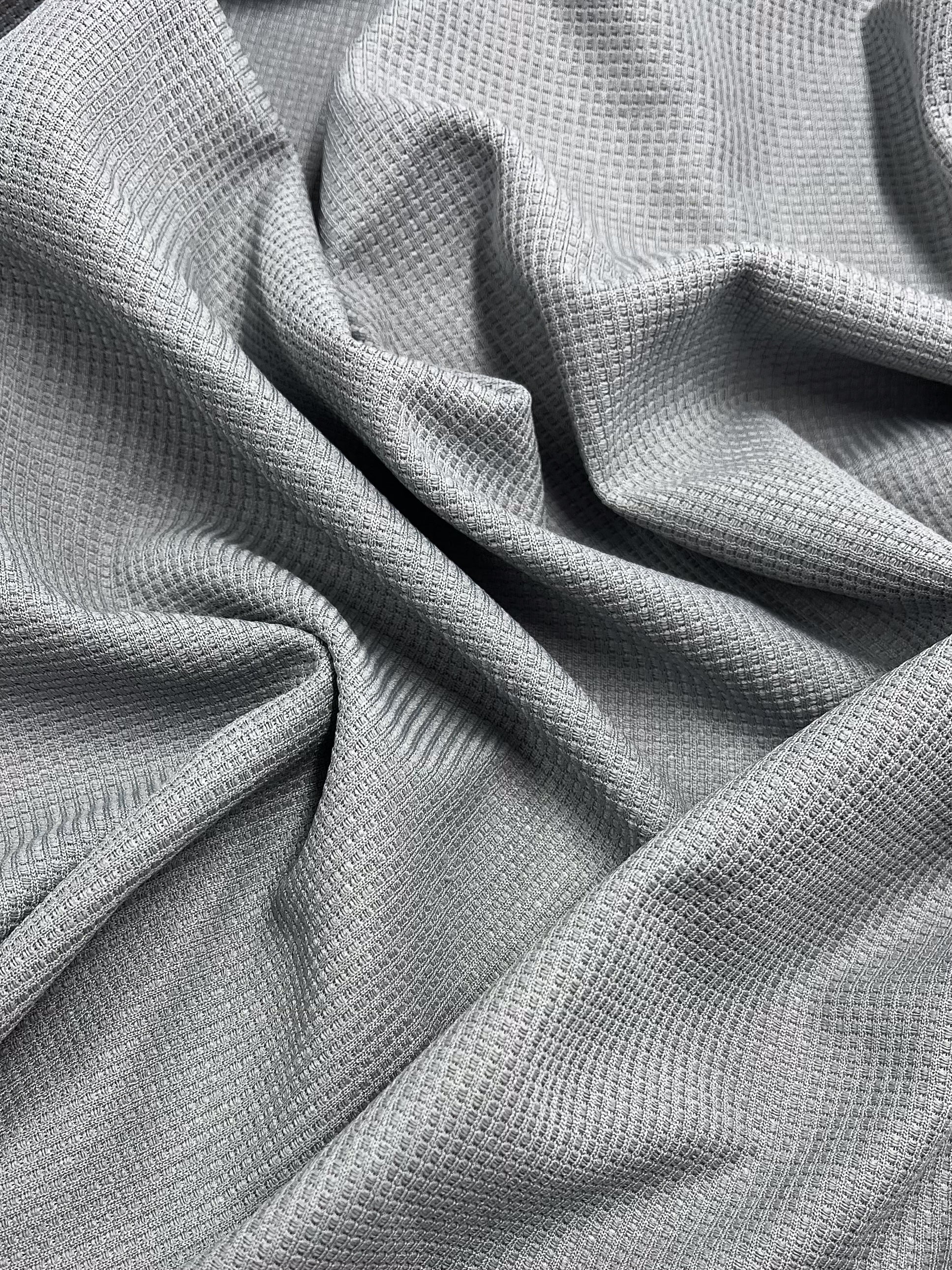 Super Cheap Fabrics' Waffle Knit - Grey - 170cm features a light gray waffle texture, shown draped and softly wrinkled to showcase its unique pattern and folds.
